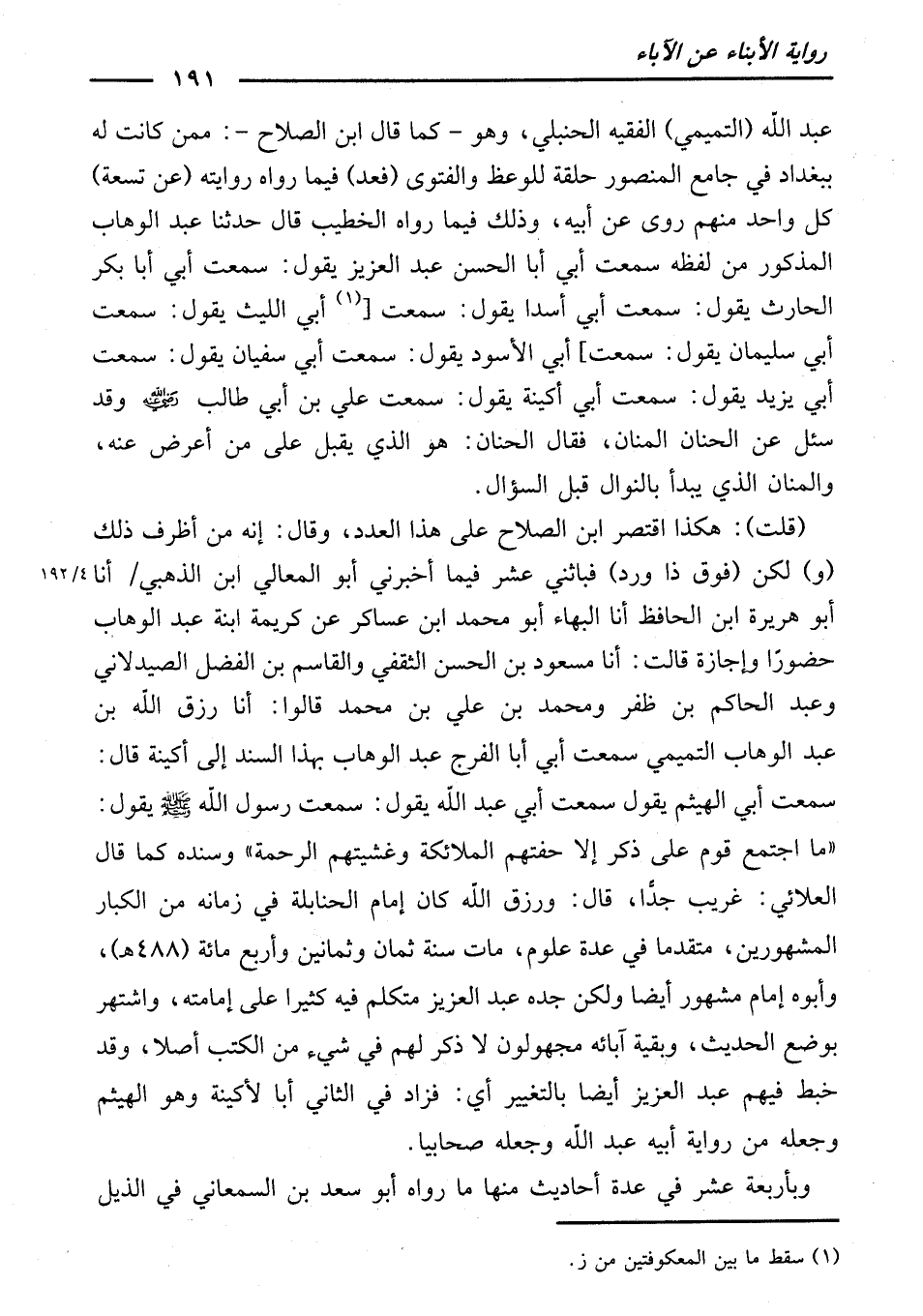 عَبْدِ اللَّهِ (التَّمِيمِيُّ) الْفَقِيهُ الْحَنْبَلِيُّ، وَهُوَ ـ كَمَا قَالَ ابْنُ الصَّلَاحِ ـ مِمَّنْ كَانَتْ لَهُ بِبَغْدَادَ فِي جَامِعِ الْمَنْصُورِ حَلْقَةٌ لِلْوَعْظِ وَالْفَتْوَى، (فَعَدْ) فِيمَا رَوَاهُ رِوَايَتَهُ (عَنْ تِسْعَةٍ) ، كُلُّ وَاحِدٍ مِنْهُمْ رَوَى عَنْ أَبِيهِ، وَذَلِكَ فِيمَا رَوَاهُ الْخَطِيبُ، قَالَ: حَدَّثَنَا عَبْدُ الْوَهَّابِ الْمَذْكُورُ مِنْ لَفْظِهِ سَمِعْتُ أَبِي أَبَا الْحَسَنِ عَبْدَ الْعَزِيزِ يَقُولُ: سَمِعْتُ أَبِي أَبَا بَكْرٍ الْحَارِثَ يَقُولُ: سَمِعْتُ أَبِي أَسَدًا يَقُولُ: سَمِعْتُ أَبِي اللَّيْثَ يَقُولُ: سَمِعْتُ أَبِي سُلَيْمَانَ يَقُولُ: سَمِعْتُ أَبِي الْأَسْوَدَ يَقُولُ: سَمِعْتُ أَبِي سُفْيَانَ يَقُولُ: سَمِعْتُ أَبِي يَزِيدَ يَقُولُ: سَمِعْتُ أَبِي أُكَيْنَةَ يَقُولُ: سَمِعْتُ عَلِيَّ بْنَ أَبِي طَالِبٍ رَضِيَ اللَّهُ عَنْهُ، وَقَدْ سُئِلَ عَنِ الْحَنَّانِ الْمَنَّانِ، فَقَالَ الْحَنَّانُ: هُوَ الَّذِي يُقْبِلُ عَلَى مَنْ أَعْرَضَ عَنْهُ، وَالْمَنَّانُ الَّذِي يَبْدَأُ بِالنَّوَالِ قَبْلَ السُّؤَالِ.