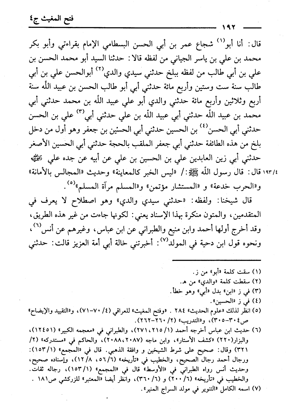 قَالَ شَيْخُنَا: وَلَفْظُهُ: حَدَّثَنِي سَيِّدِي وَالِدِي. وَهُوَ اصْطِلَاحٌ لَا يُعْرَفُ فِي الْمُتَقَدِّمِينَ، وَالْمُتُونُ مُنْكَرَةٌ بِهَذَا الْإِسْنَادِ ; يَعْنِي لِكَوْنِهَا جَاءَتْ مِنْ غَيْرِ هَذِهِ الطَّرِيقِ، وَقَدْ أَخْرَجَ أَوَّلَهَا أَحْمَدُ وَابْنُ مَنِيعٍ وَالطَّبَرَانِيُّ عَنِ ابْنِ عَبَّاسٍ، وَغَيْرُهُمْ عَنْ أَنَسٍ، وَنَحْوُهُ قَوْلُ ابْنِ دِحْيَةَ فِي الْمَوْلِدِ: أَخْبَرَتْنِي خَالَةُ أَبِي أَمَةُ الْعَزِيزِ قَالَتْ: حَدَّثَنِي