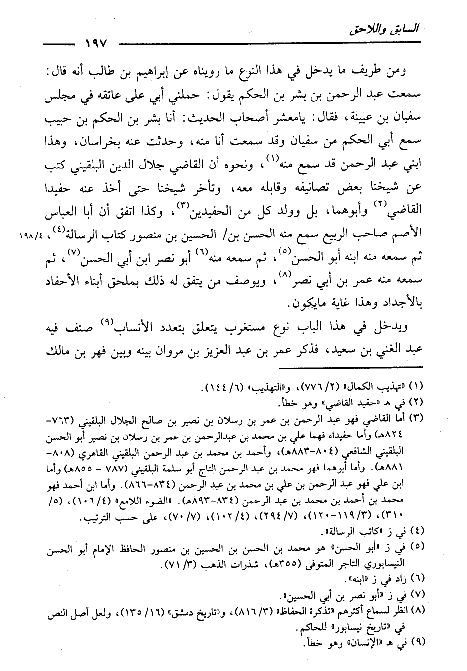 وَمِنْ طَرِيفِ مَا يَدْخُلُ فِي هَذَا النَّوْعِ مَا رَوَيْنَاهُ عَنْ إِبْرَاهِيمَ بْنِ طَالِبٍ أَنَّهُ قَالَ: سَمِعْتُ عَبْدَ الرَّحْمَنِ بْنَ بِشْرِ بْنِ الْحَكَمِ يَقُولُ: حَمَلَنِي أَبِي عَلَى عَاتِقِهِ فِي مَجْلِسِ سُفْيَانَ بْنِ عُيَيْنَةَ، فَقَالَ: يَا مَعْشَرَ أَصْحَابِ الْحَدِيثِ: أَنَا بِشْرُ بْنُ الْحَكَمِ بْنِ حَبِيبٍ، سَمِعَ أَبِي الْحَكَمُ مِنْ سُفْيَانَ، وَقَدْ سَمِعْتُ أَنَا مِنْهُ، وَحَدَّثْتُ عَنْهُ بِخُرَاسَانَ، وَهَذَا ابْنِي عَبْدُ الرَّحْمَنِ قَدْ سَمِعَ مِنْهُ. وَنَحْوُهُ أَنَّ الْقَاضِيَ جَلَالَ الدِّينِ الْبُلْقِينِيَّ كَتَبَ عَنْ شَيْخِنَا بَعْضَ تَصَانِيفِهِ وَقَابَلَهُ مَعَهُ، وَتَأَخَّرَ شَيْخُنَا حَتَّى أَخَذَ عَنْهُ حَفِيدَا الْقَاضِي وَأَبُوهُمَا، بَلْ وَوَلَدُ كُلٍّ مِنَ الْحَفِيدَيْنِ، وَكَذَا اتَّفَقَ أَنَّ أَبَا الْعَبَّاسِ الْأَصَمَّ صَاحِبَ الرَّبِيعِ سَمِعَ مِنْهُ الْحَسَنُ بْنُ الْحُسَيْنِ بْنِ مَنْصُورٍ كِتَابَ (الرِّسَالَةِ) ، ثُمَّ سَمِعَهُ مِنْهُ ابْنُهُ أَبُو الْحَسَنِ، ثُمَّ سَمِعَهُ مِنْهُ أَبُو نَصْرِ بْنُ أَبِي الْحَسَنِ، ثُمَّ سَمِعَهُ مِنْهُ عُمَرُ بْنُ أَبِي نَصْرٍ، وَيُوصَفُ مَنْ يَتَّفِقُ لَهُ ذَلِكَ بِمُلْحَقِ أَبْنَاءِ الْأَحْفَادِ بِالْأَجْدَادِ، وَهَذَا غَايَةُ مَا يَكُونُ.