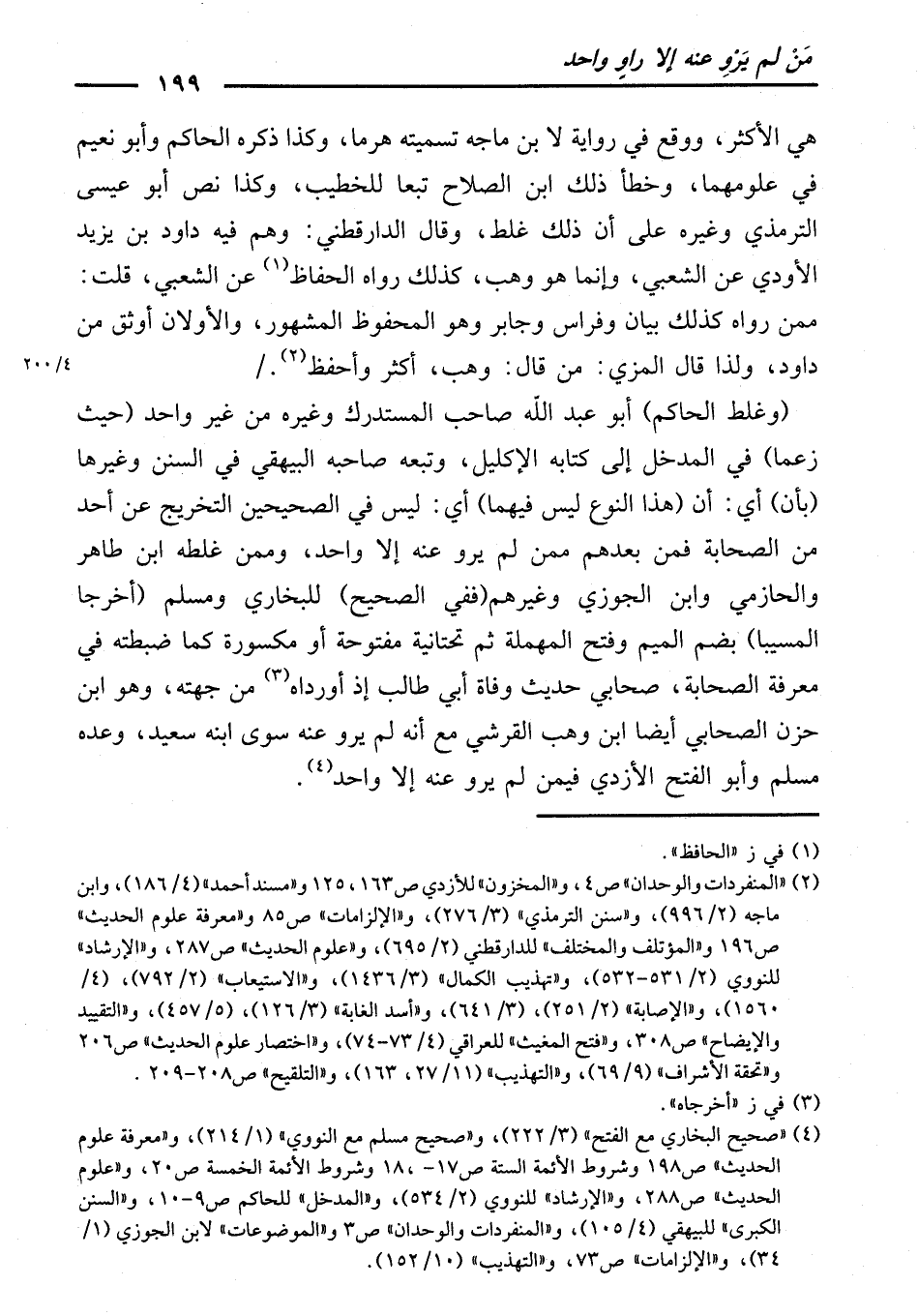 (وَغُلِّطَ الْحَاكِمُ) أَبُو عَبْدِ اللَّهِ صَاحِبُ (الْمُسْتَدْرَكِ) وَغَيْرُهُ مِنْ غَيْرِ وَاحِدٍ (حَيْثُ زَعَمَا) فِي الْمَدْخَلِ إِلَى كِتَابِهِ (الْإِكْلِيلِ) ، وَتَبِعَهُ صَاحِبُهُ فِي السُّنَنِ وَغَيْرِهَا (بِأَنَّ) ; أَيْ: أَنَّ (هَذَا النَّوْعَ لَيْسَ فِيهِمَا) ; أَيْ: لَيْسَ فِي الصَّحِيحَيْنِ التَّخْرِيجُ عَنْ أَحَدٍ مِنَ الصَّحَابَةِ فَمَنْ بَعْدَهُمْ مِمَّنْ لَمْ يَرْوِ عَنْهُ إِلَّا وَاحِدٌ، وَمِمَّنْ غَلَّطَهُ ابْنُ طَاهِرٍ وَالْحَازِمِيُّ وَابْنُ الْجَوْزِيُّ وَغَيْرُهُمْ (فَفِي الصَّحِيحِ) لِلْبُخَارِيِّ وَمُسْلِمٍ (أَخْرَجَا الْمُسَيَّبَا) بِضَمِّ الْمِيمِ وَفَتْحِ الْمُهْمَلَةِ ثُمَّ تَحْتَانِيَّةٍ مَفْتُوحَةٍ أَوْ مَكْسُورَةٍ، كَمَا ضَبَطْتُهُ فِي مَعْرِفَةِ الصَّحَابَةِ، صَحَابِيَّ حَدِيثِ وَفَاةِ أَبِي طَالِبٍ ; إِذْ أَوْرَدَاهُ مِنْ جِهَتِهِ، وَهُوَ ابْنُ حَزْنٍ الصَّحَابِيُّ، أَيْضًا ابْنُ وَهْبٍ الْقُرَشِيُّ، مَعَ أَنَّهُ لَمْ يَرْوِ عَنْهُ سِوَى ابْنِهِ سَعِيدٍ، وَعَدَّهُ مُسْلِمٌ وَأَبُو الْفَتْحِ الْأَزْدِيُّ فِيمَنْ لَمْ يَرْوِ عَنْهُ إِلَّا وَاحِدٌ.