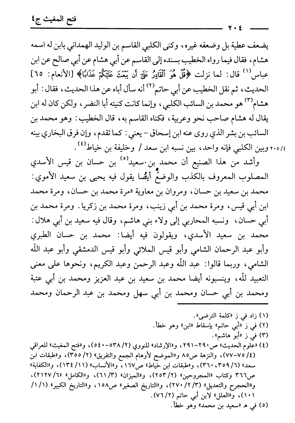 يُضَعِّفُ عَطِيَّةَ، بَلْ وَضَعَّفَهُ غَيْرُهُ. وَكَنَّى الْكَلْبِيَّ الْقَاسِمُ بْنُ الْوَلِيدِ الْهَمْدَانِيُّ بِابْنٍ لَهُ اسْمُهُ هِشَامٌ، فَقَالَ فِيمَا رَوَاهُ الْخَطِيبُ بِسَنَدِهِ إِلَى الْقَاسِمِ، عَنْ أَبِي هِشَامٍ، عَنْ أَبِي صَالِحٍ، عَنِ ابْنِ عَبَّاسٍ قَالَ: لَمَّا نَزَلَتْ: {قُلْ هُوَ الْقَادِرُ عَلَى أَنْ يَبْعَثَ عَلَيْكُمْ عَذَابًا} [الأنعام: 65] الْحَدِيثَ. ثُمَّ نَقَلَ الْخَطِيبُ عَنِ ابْنِ أَبِي حَاتِمٍ أَنَّهُ سَأَلَ أَبَاهُ عَنْ هَذَا الْحَدِيثِ، فَقَالَ: أَبُو هِشَامٍ هُوَ مُحَمَّدُ بْنُ السَّائِبِ الْكَلْبِيُّ، وَإِنَّمَا كَانَتْ كُنْيَتُهُ أَبَا النَّضْرِ، وَلَكِنْ كَانَ لَهُ ابْنٌ يُقَالُ لَهُ: هِشَامٌ. صَاحِبَ نَحْوٍ وَعَرَبِيَّةٍ، فَكَنَّاهُ الْقَاسِمُ بِهِ. قَالَ الْخَطِيبُ: وَهُوَ مُحَمَّدُ بْنُ السَّائِبِ بْنِ بِشْرٍ الَّذِي رَوَى عَنْهُ ابْنُ إِسْحَاقَ. يَعْنِي كَمَا تَقَدَّمَ، وَإِنْ فَرَّقَ الْبُخَارِيُّ بَيْنَهُ وَبَيْنَ الْكَلْبِيِّ ; فَإِنَّهُ وَاحِدٌ، بَيَّنَ نَسَبَهُ ابْنُ سَعْدٍ وَخَلِيفَةُ بْنُ خَيَّاطٍ.