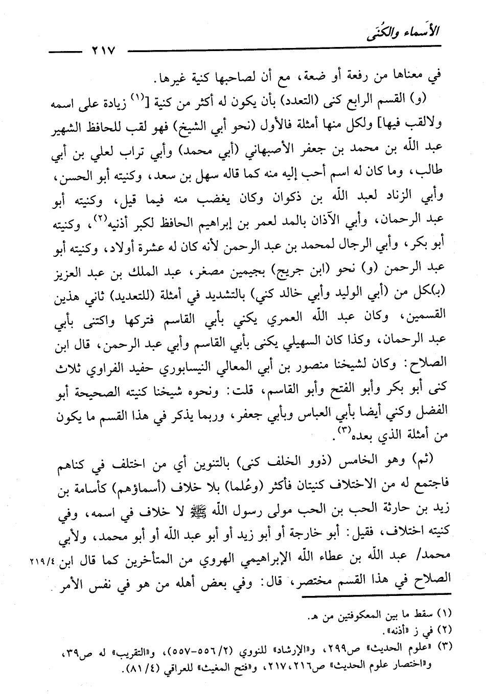 قَالَ ابْنُ الصَّلَاحِ: وَكَانَ لِشَيْخِنَا مَنْصُورِ بْنِ أَبِي الْمَعَالِي النَّيْسَابُورِيِّ حَفِيدِ الْفَرَاوِيِّ ثَلَاثُ كُنًى ; أَبُو بَكْرٍ وَأَبُو الْفَتْحِ وَأَبُو الْقَاسِمِ، قُلْتُ: وَنَحْوُهُ شَيْخُنَا كُنْيَتُهُ الصَّحِيحَةُ أَبُو الْفَضْلِ، وَكُنِّيَ أَيْضًا بِأَبِي الْعَبَّاسِ وَبِأَبِي جَعْفَرٍ، وَرُبَّمَا يُذْكَرُ فِي هَذَا الْقِسْمِ مَا يَكُونُ مِنْ أَمْثِلَةِ الَّذِي بَعْدَهُ.