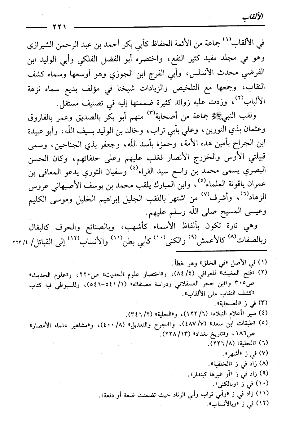 فِي الْأَلْقَابِ جَمَاعَةٌ مِنَ الْأَئِمَّةِ الْحُفَّاظِ ; كَأَبِي بَكْرٍ أَحْمَدَ بْنِ عَبْدِ الرَّحْمَنِ الشِّيرَازِيِّ، وَهُوَ فِي مُجَلَّدٍ مُفِيدٍ كَثِيرِ النَّفْعِ، وَاخْتَصَرَهُ أَبُو الْفَضْلِ بْنُ طَاهِرٍ ; وَكَأَبِي الْفَضْلِ الْفَلَكِيِّ وَأَبِي الْوَلِيدِ بْنِ الْفَرْضِيِّ، مُحَدِّثِ الْأَنْدَلُسِ، وَأَبِي الْفَرَجِ بْنِ الْجَوْزِيِّ، وَهُوَ أَوْسَعُهَا، وَسَمَّاهُ (كَشْفَ النِّقَابِ) ، وَجَمَعَهَا مَعَ التَّلْخِيصِ وَالزِّيَادَاتِ شَيْخُنَا فِي مُؤَلَّفٍ بَدِيعٍ سَمَّاهُ (نُزْهَةَ الْأَلْبَابِ) ، وَزِدْتُ عَلَيْهِ زَوَائِدَ كَثِيرَةً ضَمَمْتُهَا إِلَيْهِ فِي تَصْنِيفٍ مُسْتَقِلٍّ.