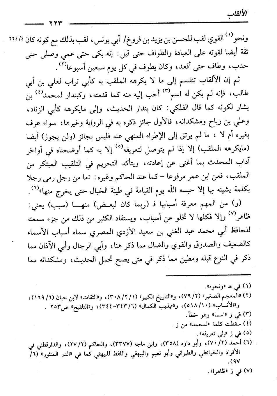 ثُمَّ إِنَّ الْأَلْقَابَ تَنْقَسِمُ إِلَى مَا لَا يَكْرَهُهُ الْمُلَقَّبُ بِهِ ; كَأَبِي تُرَابٍ، لِعَلِيِّ بْنِ أَبِي طَالِبٍ ; فَإِنَّهُ لَمْ يَكُنْ لَهُ اسْمٌ أَحَبُّ إِلَيْهِ مِنْهُ، كَمَا قَدَّمْتُهُ، وَكَبُنْدَارٍ لِمُحَمَّدِ بْنِ بَشَّارٍ ; لِكَوْنِهِ كَمَا قَالَ الْفَلَكِيُّ: كَانَ بُنْدَارَ الْحَدِيثِ، وَإِلَى مَا يَكْرَهُهُ ; كَأَبِي الزِّنَادِ وَعَلِيِّ بْنِ رَبَاحٍ وَمُشْكُدَانَةَ، فَالْأَوَّلُ جَائِزٌ ذِكْرُهُ بِهِ فِي الرِّوَايَةِ وَغَيْرِهَا، سَوَاءٌ عُرِفَ بِغَيْرِهِ أَمْ لَا، مَا لَمْ يَرْتَقِ إِلَى الْإِطْرَاءِ الْمَنْهِيِّ عَنْهُ، فَلَيْسَ بِجَائِزٍ، (وَلَنْ يَجُوزَ) أَيْضًا (مَا يَكْرَهُهُ الْمُلَقَّبُ) إِلَّا إِذَا لَمْ يُتَوَصَّلْ لِتَعْرِيفِهِ إِلَّا بِهِ، كَمَا أَوْضَحْنَاهُ فِي أَوَاخِرَ آدَابِ الْمُحَدِّثِ بِمَا أَغْنَى عَنْ إِعَادَتِهِ، وَيَتَأَكَّدُ التَّحْرِيمُ فِي التَّلْقِيبِ الْمُبْتَكَرِ مِنَ الْمُلَقَّبِ، فَعَنِ ابْنِ عُمَرَ مَرْفُوعًا - كَمَا عِنْدَ الْحَاكِمِ وَغَيْرِهِ: ( «مَا مِنْ رَجُلٍ رَمَى رَجُلًا بِكَلِمَةٍ يَشِينُهُ بِهَا إِلَّا حَبَسَهُ اللَّهُ يَوْمَ الْقِيَامَةِ فِي طِينَةِ الْخَبَالِ حَتَّى يَخْرُجَ مِنْهَا» ) .