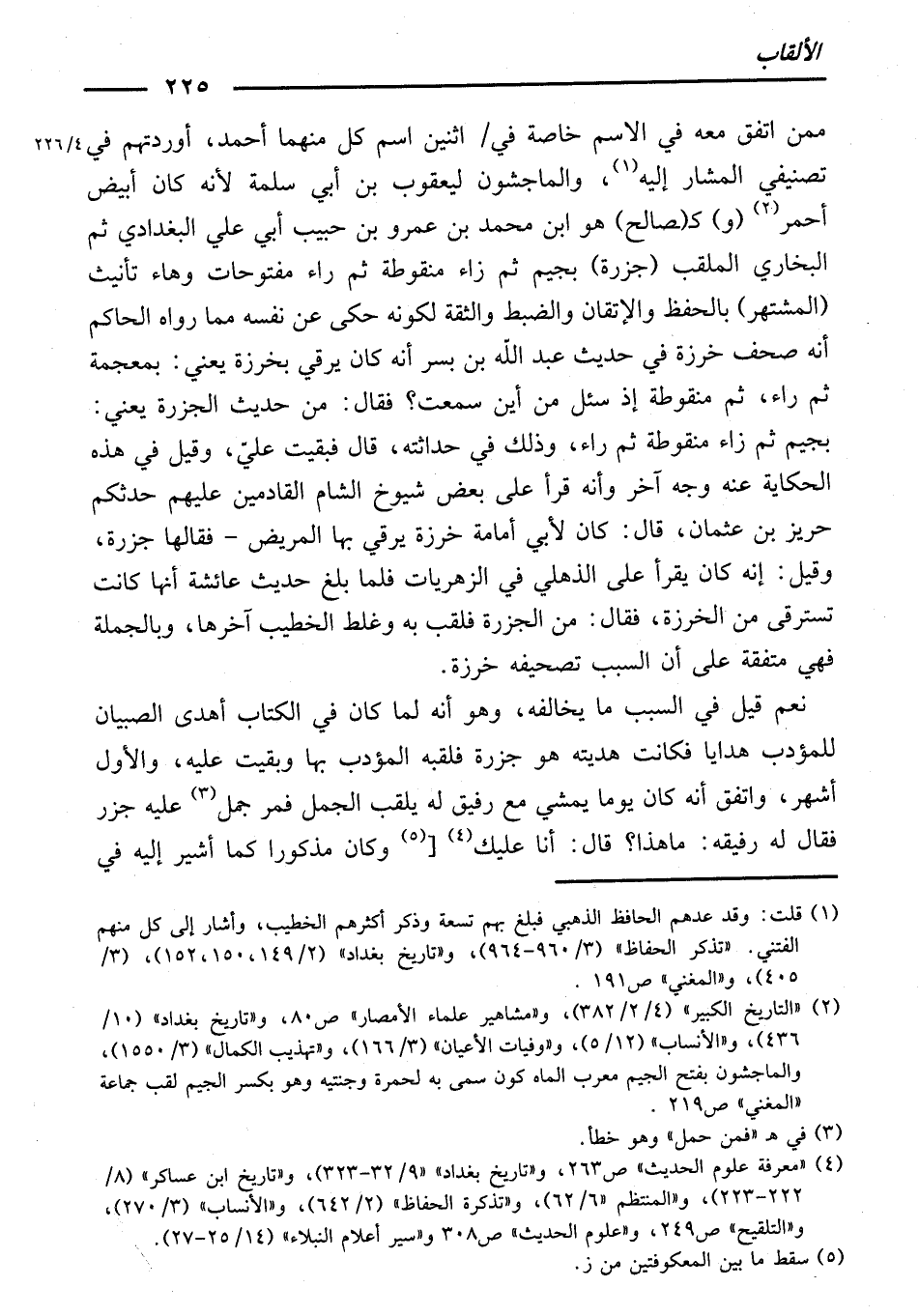 مِمَّنِ اتَّفَقَ مَعَهُ فِي الِاسْمِ خَاصَّةً فِي اثْنَيْنِ، اسْمُ كُلٍّ مِنْهُمَا أَحْمَدُ، أَوْرَدْتُهُمْ فِي تَصْنِيفِي الْمُشَارِ إِلَيْهِ، وَالْمَاجِشُونُ لِيَعْقُوبَ بْنِ أَبِي سَلَمَةَ ; لِأَنَّهُ كَانَ أَبْيَضَ أَحْمَرَ (وَ) كَـ (صَالِحٍ) هُوَ ابْنُ مُحَمَّدِ بْنِ عَمْرِو بْنِ حَبِيبٍ أَبِي عَلِيٍّ الْبَغْدَادِيُّ، ثُمَّ الْبُخَارِيُّ، الْمُلَقَّبُ (جَزَرَةَ) بِجِيمٍ ثُمَّ زَاءٍ مَنْقُوطَةٍ ثُمَّ رَاءٍ مَفْتُوحَاتٍ وَهَاءِ تَأْنِيثٍ، (الْمُشْتَهِرِ) بِالْحِفْظِ وَالْإِتْقَانِ وَالضَّبْطِ وَالثِّقَةِ ; لِكَوْنِهِ حَكَى عَنْ نَفْسِهِ مِمَّا رَوَاهُ الْحَاكِمُ أَنَّهُ صَحَّفَ خَرَزَةَ فِي حَدِيثِ عَبْدِ اللَّهِ بْنِ بُسْرٍ أَنَّهُ كَانَ يُرْقَى بِخَرَزَةٍ، يَعْنِي بِمُعْجَمَةٍ ثُمَّ رَاءٍ ثُمَّ زَاءٍ مَنْقُوطَةٍ، إِذْ سُئِلَ مِنْ أَيْنَ سَمِعْتَ؟ فَقَالَ: مِنْ حَدِيثِ الْجَزَرَةِ. يَعْنِي بِجِيمٍ ثُمَّ زَاءٍ مَنْقُوطَةٍ ثُمَّ رَاءٍ، وَذَلِكَ فِي حَدَاثَتِهِ، قَالَ: فَبَقِيَتْ عَلَيَّ. وَقِيلَ: فِي هَذِهِ الْحِكَايَةِ عَنْهُ وَجْهٌ آخَرُ، وَأَنَّهُ قَرَأَ عَلَى بَعْضِ شُيُوخٍ الشَّامِ الْقَادِمِينَ عَلَيْهِمْ حَدَّثَكُمْ حَرِيزُ بْنُ عُثْمَانَ؟ قَالَ: كَانَ لِأَبِي أُمَامَةَ خَرَزَةٌ يَرْقِي بِهَا الْمَرِيضَ فَقَالَهَا (جَزَرَةٌ) . وَقِيلَ: إِنَّهُ كَانَ يَقْرَأُ عَلَى الذُّهْلِيِّ فِي الزُّهْرِيَّاتِ، فَلَمَّا بَلَغَ حَدِيثَ عَائِشَةَ أَنَّهَا كَانَتْ تَسْتَرِقِي مِنَ الْخَرَزَةِ، فَقَالَ: مِنَ الْجَزَرَةِ. فَلُقِّبَ بِهِ. وَغَلَّطَ الْخَطِيبُ آخِرَهَا، وَبِالْجُمْلَةِ فَهِيَ مُتَّفِقَةٌ عَلَى أَنَّ السَّبَبَ تَصْحِيفُهُ خَرَزَةَ، نَعَمْ، قِيلَ فِي السَّبَبِ مَا يُخَالِفُهُ، وَهُوَ أَنَّهُ لَمَّا كَانَ فِي الْكُتَّابِ أَهْدَى الصِّبْيَانُ لِلْمُؤَدِّبِ هَدَايَا فَكَانَتْ هَدِيَّتُهُ هُوَ جَزَرَةً ; فَلَقَّبَهُ الْمُؤَدِّبُ بِهَا وَبَقِيَتْ عَلَيْهِ، وَالْأَوَّلُ أَشْهَرُ، وَاتُّفِقَ أَنَّهُ كَانَ يَوْمًا يَمْشِي مَعَ رَفِيقٍ لَهُ يُلَقَّبُ الْجَمَلَ، فَمَرَّ جَمَلٌ عَلَيْهِ جَزَرٌ، فَقَالَ لَهُ رَفِيقُهُ: مَا هَذَا؟ قَالَ: أَنَا عَلَيْكَ. وَكَانَ مَذْكُورًا كَمَا أُشِيرَ إِلَيْهِ فِي