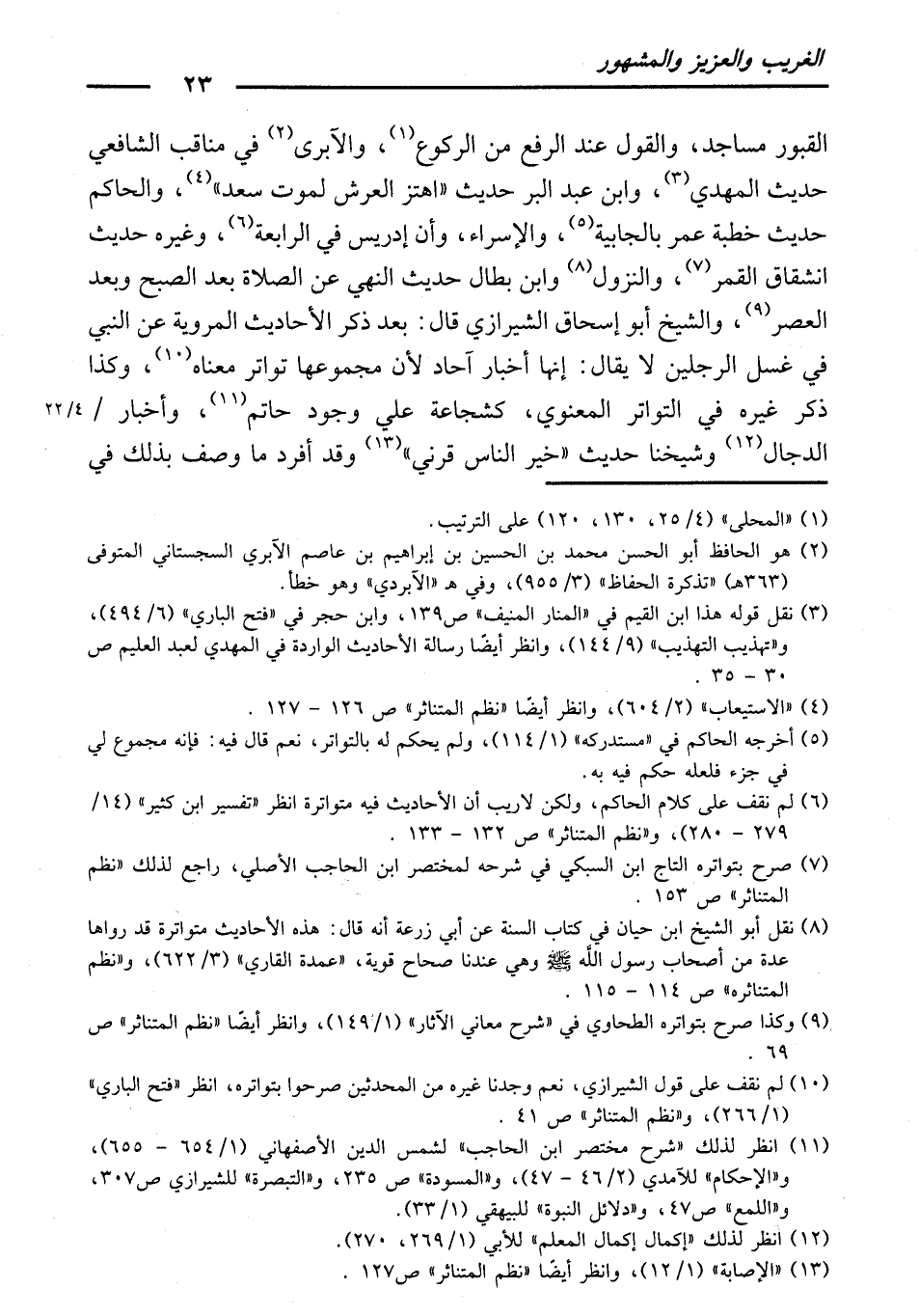 الْقُبُورِ مَسَاجِدَ، وَالْقَوْلِ عِنْدَ الرَّفْعِ مِنَ الرُّكُوعِ. وَالْآبُرِيُّ فِي مَنَاقِبِ الشَّافِعِيِّ حَدِيثَ الْمَهْدِيِّ. وَابْنُ عَبْدِ الْبَرِّ حَدِيثَ: ( «اهْتَزَّ الْعَرْشُ لِمَوْتِ سَعْدٍ» ) . وَالْحَاكِمُ حَدِيثَ خُطْبَةِ عُمَرَ بِالْجَابِيَةِ، وَالْإِسْرَاءِ، وَأَنَّ إِدْرِيسَ فِي الرَّابِعَةِ. وَغَيْرُهُ حَدِيثَ انْشِقَاقِ الْقَمَرِ، وَالنُّزُولِ. وَابْنُ بَطَّالٍ حَدِيثَ النَّهْيِ عَنِ الصَّلَاةِ بَعْدَ الصُّبْحِ وَبَعْدَ الْعَصْرِ. وَالشَّيْخُ أَبُو إِسْحَاقَ الشِّيرَازِيُّ قَالَ بَعْدَ ذِكْرِ الْأَحَادِيثِ الْمَرْوِيَّةِ عَنِ النَّبِيِّ - صَلَّى اللَّهُ عَلَيْهِ وَسَلَّمَ - فِي غَسْلِ الرِّجْلَيْنِ: لَا يُقَالُ: إِنَّهَا أَخْبَارُ آحَادٍ ; لِأَنَّ مَجْمُوعَهَا تَوَاتَرَ مَعْنَاهُ. وَكَذَا ذَكَرَ غَيْرُهُ فِي التَّوَاتُرِ الْمَعْنَوِيِّ ; كَشَجَاعَةِ عَلِيٍّ، وَجُودِ حَاتِمٍ، وَأَخْبَارِ الدَّجَّالِ. وَشَيْخُنَا حَدِيثَ: ( «خَيْرُ النَّاسِ قَرْنِي» ) . وَقَدْ أُفْرِدَ مَا وُصِفَ بِذَلِكَ فِي