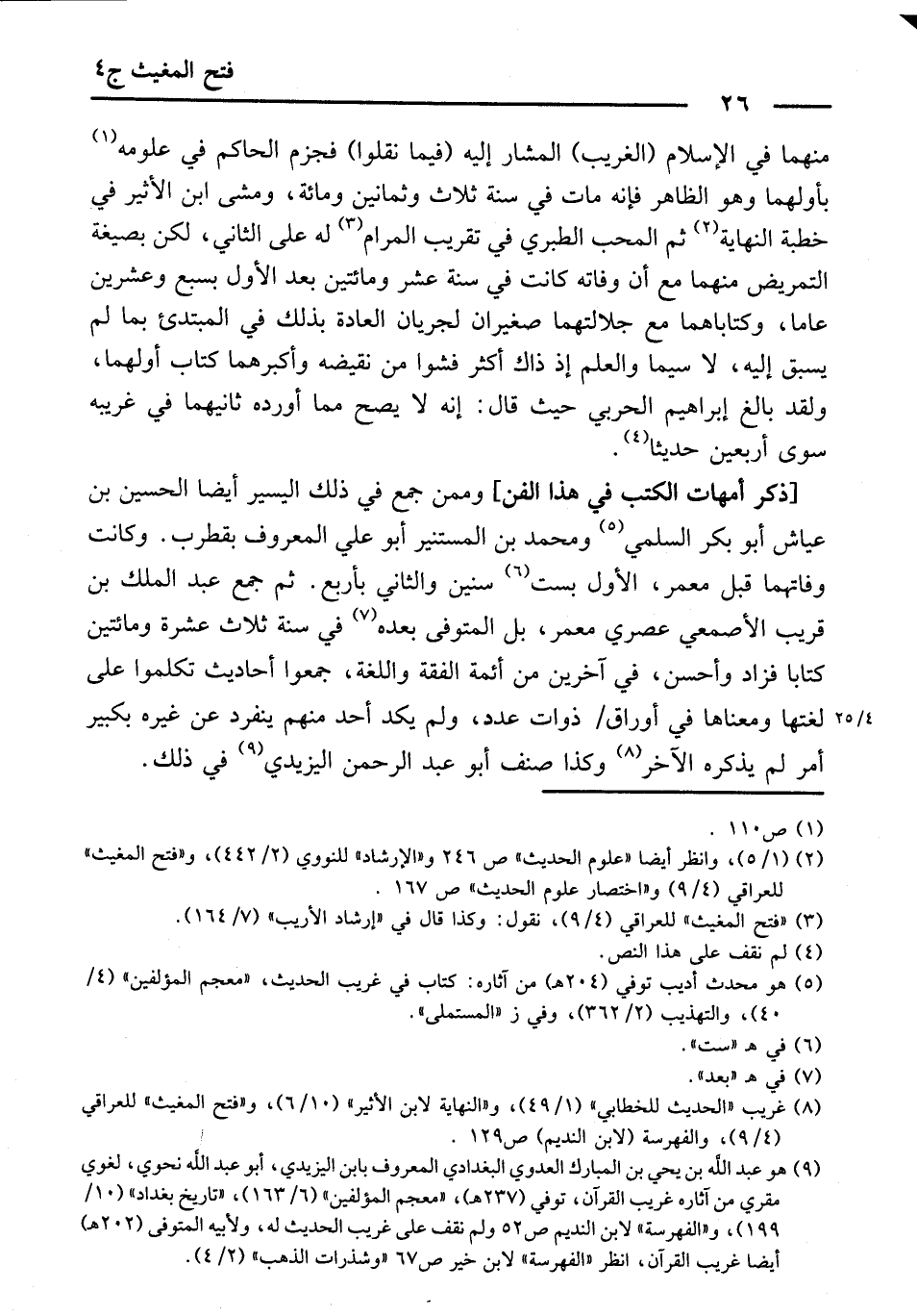 [ذِكْرُ أُمَّهَاتَ الْكُتُبِ فِي هَذَا الْفَنِّ] وَمِمَّنْ جَمَعَ فِي ذَلِكَ الْيَسِيرَ أَيْضًا الْحُسَيْنُ بْنُ عَيَّاشٍ أَبُو بَكْرٍ السُّلَمِيُّ وَمُحَمَّدُ بْنُ الْمُسْتَنِيرِ أَبُو عَلِيٍّ الْمَعْرُوفُ بِقُطْرُبٍ. وَكَانَتْ وَفَاتُهُمَا قَبْلَ مَعْمَرٍ، الْأَوَّلُ بِسِتِّ سِنِينَ، وَالثَّانِي بِأَرْبَعٍ. ثُمَّ جَمَعَ عَبْدُ الْمَلِكِ بْنُ قُرَيْبٍ الْأَصْمَعِيُّ عَصْرِيُّ مَعْمَرٍ، بَلِ الْمُتَوَفَّى بَعْدَهُ فِي سَنَةِ ثَلَاثَ عَشْرَةَ وَمِائَتَيْنِ، كِتَابًا، فَزَادَ وَأَحْسَنَ. فِي آخَرِينَ مِنْ أَئِمَّةِ الْفِقْهِ وَاللُّغَةِ جَمَعُوا أَحَادِيثَ تَكَلَّمُوا عَلَى لُغَتِهَا وَمَعْنَاهَا فِي أَوْرَاقٍ ذَوَاتِ عَدَدٍ. وَلَمْ يَكَدْ أَحَدٌ مِنْهُمْ يَنْفَرِدُ عَنْ غَيْرِهِ بِكَبِيرِ أَمْرٍ لَمْ يَذْكُرْهُ الْآخَرُ، وَكَذَا صَنَّفَ أَبُو عَبْدِ الرَّحْمَنِ الْيَزِيدِيُّ فِي ذَلِكَ.