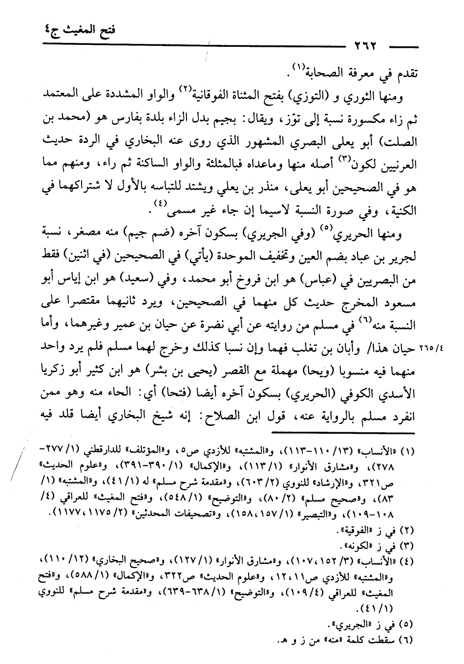 وَمِنْهَا الْحَرِيرِيُّ (وَفِي الْجُرَيْرِي) بِسُكُونِ آخِرِهِ (ضَمُّ جِيمٍ) مِنْهُ، مُصَغَّرٌ، نِسْبَةً لِجُرَيْرِ بْنِ عُبَادٍ بِضَمِّ الْعَيْنِ، وَتَخْفِيفِ الْمُوَحَّدَةِ، (يَأْتِي) فِي الصَّحِيحَيْنِ (فِي اثْنَيْنِ) فَقَطْ مِنَ الْبَصْرِيِّينَ فِي (عَبَّاسٍ) هُوَ ابْنُ فَرُّوخٍ أَبُو مُحَمَّدٍ، وَفِي (سَعِيدٍ) هُوَ ابْنُ إِيَاسٍ أَبُو مَسْعُودٍ الْمُخَرَّجُ حَدِيثُ كُلٍّ مِنْهُمَا فِي الصَّحِيحَيْنِ، وَيَرِدُ ثَانِيهِمَا مُقْتَصِرًا عَلَى النِّسْبَةِ مِنْهُ فِي مُسْلِمٍ مِنْ رِوَايَتِهِ عَنْ أَبِي نَضْرَةَ عَنْ حَيَّانَ بْنِ عُمَيْرٍ وَغَيْرِهِمَا، وَأَمَّا حَيَّانُ هَذَا وَأَبَانُ بْنُ تَغْلِبَ فَهُمَا وَإِنْ نُسِبَا كَذَلِكَ، وَخَرَّجَ لَهُمَا مُسْلِمٌ فَلَمْ يَرِدْ وَاحِدٌ مِنْهُمَا فِيهِ مَنْسُوبًا، (وَبِحَا) مُهْمَلَةٍ مَعَ الْقَصْرِ (يَحْيَى بْنِ بِشْرِ) هُوَ ابْنُ كَثِيرٍ أَبُو زَكَرِيَّا الْأَسَدِيُّ الْكُوفِيُّ (الْحَرِيرِي) بِسُكُونِ آخِرِهِ أَيْضًا، (فُتِحَا) أَيِ: الْحَاءُ مِنْهُ، وَهُوَ مِمَّنِ انْفَرَدَ مُسْلِمٌ بِالرِّوَايَةِ عَنْهُ، وَقَوْلُ ابْنِ الصَّلَاحِ: إِنَّهُ شَيْخُ الْبُخَارِيِّ. أَيْضًا قَلَّدَ فِيهِ عِيَاضًا،