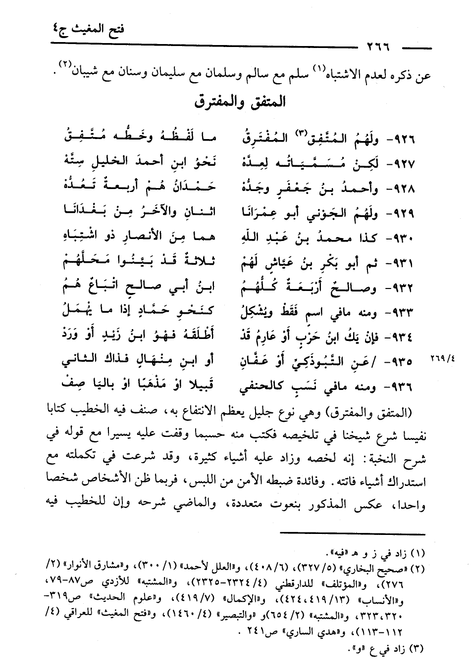 (الْمُتَّفِقُ وَالْمُفْتَرِقُ) وَهِيَ نَوْعٌ جَلِيلٌ يَعْظُمُ الِانْتِفَاعُ بِهِ، صَنَّفَ فِيهِ الْخَطِيبُ كِتَابًا نَفِيسًا شَرَعَ شَيْخُنَا فِي تَلْخِيصِهِ فَكَتَبَ مِنْهُ حَسْبَمَا وَقَفْتُ عَلَيْهِ يَسِيرًا مَعَ قَوْلِهِ فِي شَرْحِ النُّخْبَةِ: إِنَّهُ لَخَّصَهُ وَزَادَ عَلَيْهِ أَشْيَاءَ كَثِيرَةَ، وَقَدْ شَرَعْتُ فِي تَكْمِلَتِهِ مَعَ اسْتِدْرَاكِ أَشْيَاءَ فَاتَتْهُ، وَفَائِدَةُ ضَبْطِهِ: الْأَمْنُ مِنَ اللَّبْسِ، فَرُبَّمَا ظَنَّ الْأَشْخَاصَ شَخْصًا وَاحِدًا عَكْسَ الْمَذْكُورِ بِنُعُوتٍ مُتَعَدِّدَةٍ، الْمَاضِي شَرْحُهُ، وَإِنَّ لِلْخَطِيبِ فِيهِ
