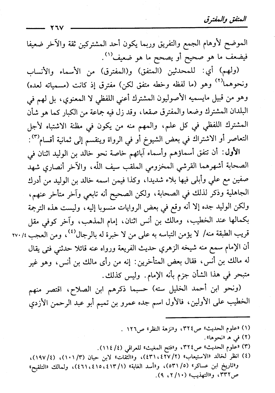 (وَلَهُمُ) أَيْ: لِلْمُحَدِّثِينَ (الْمُتِّفِقُ) وَ (الْمُفْتَرِقُ) مِنَ الْأَسْمَاءِ وَالْأَنْسَابِ وَنَحْوِهِمَا، وَهُوَ (مَا لَفْظُهُ وَخَطُّهُ مُتَّفِقٌ لَكِنْ) مُفْتَرِقٌ إِذْ كَانَتْ (مُسَمَّيَاتُهُ لِعِدَّهْ) وَهُوَ مِنْ قَبِيلِ مَا يُسَمِّيهِ الْأُصُولِيُّونَ الْمُشْتَرَكَ - أَعْنِي اللَّفْظِيَّ لَا الْمَعْنَوِيَّ - بَلْ لَهُمْ فِي الْبُلْدَانِ الْمُشْتَرِكُ وَضْعًا، وَالْمُفْتَرِقُ صُقْعًا، وَقَدْ زَلَّ فِيهِ جَمَاعَةٌ مِنَ الْكِبَارِ كَمَا هُوَ شَأْنُ الْمُشْتَرَكِ اللَّفْظِيِّ فِي كُلِّ عِلْمٍ، وَالْمُهِمُّ مِنْهُ مَنْ يَكُونُ فِي مَظِنَّةِ الِاشْتِبَاهِ لِأَجْلِ التَّعَاصُرِ أَوِ الِاشْتِرَاكِ فِي بَعْضِ الشُّيُوخِ أَوْ فِي الرُّوَاةِ