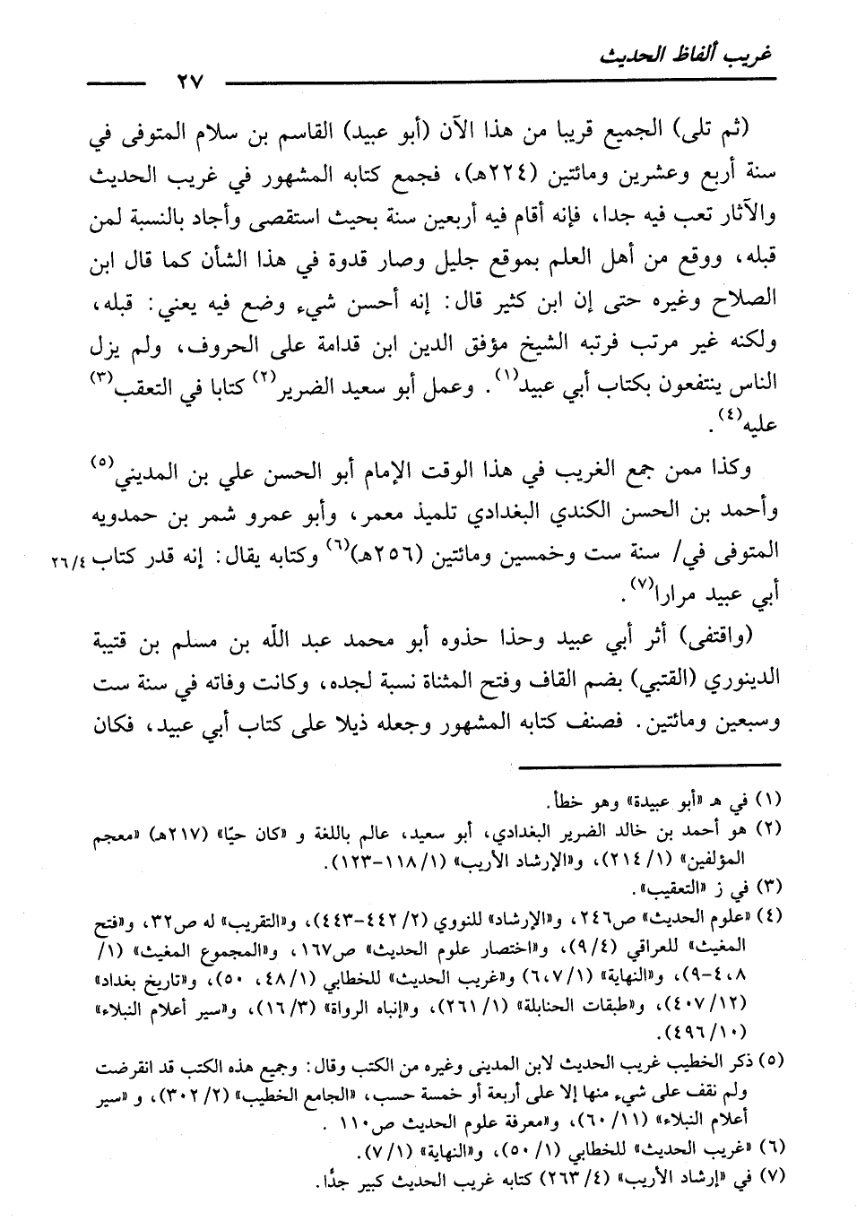 (ثُمَّ تَلَى) الْجَمِيعَ قَرِيبًا مِنْ هَذَا الْآنَ (أَبُو عُبَيْدٍ) الْقَاسِمُ بْنُ سَلَّامٍ، الْمُتَوَفَّى فِي سَنَةِ أَرْبَعٍ وَعِشْرِينَ وَمِائَتَيْنِ (224هـ) ، فَجَمَعَ كِتَابَهُ الْمَشْهُورَ فِي غَرِيبِ الْحَدِيثِ وَالْآثَارِ، تَعِبَ فِيهِ جِدًّا ; فَإِنَّهُ أَقَامَ فِيهِ أَرْبَعِينَ سَنَةً بِحَيْثُ اسْتَقْصَى وَأَجَادَ بِالنِّسْبَةِ لِمَنْ قَبْلَهُ، وَوَقَعَ مِنْ أَهْلِ الْعِلْمِ بِمَوْقِعٍ جَلِيلٍ، وَصَارَ قُدْوَةً فِي هَذَا الشَّأْنِ كَمَا قَالَ ابْنُ الصَّلَاحِ وَغَيْرُهُ، حَتَّى إِنَّ ابْنَ كَثِيرٍ قَالَ: إِنَّهُ أَحْسَنُ شَيْءٍ وُضِعَ فِيهِ، يَعْنِي قَبْلَهُ. وَلَكِنَّهُ غَيْرُ مُرَتَّبٍ، فَرَتَّبَهُ الشَّيْخُ مُوَفَّقُ الدِّينِ بْنُ قُدَامَةَ عَلَى الْحُرُوفِ، وَلَمْ يَزَلِ النَّاسُ يَنْتَفِعُونَ بِكِتَابِ أَبِي عُبَيْدٍ. وَعَمِلَ أَبُو سَعِيدٍ الضَّرِيرُ كِتَابًا فِي التَّعَقُّبِ عَلَيْهِ.