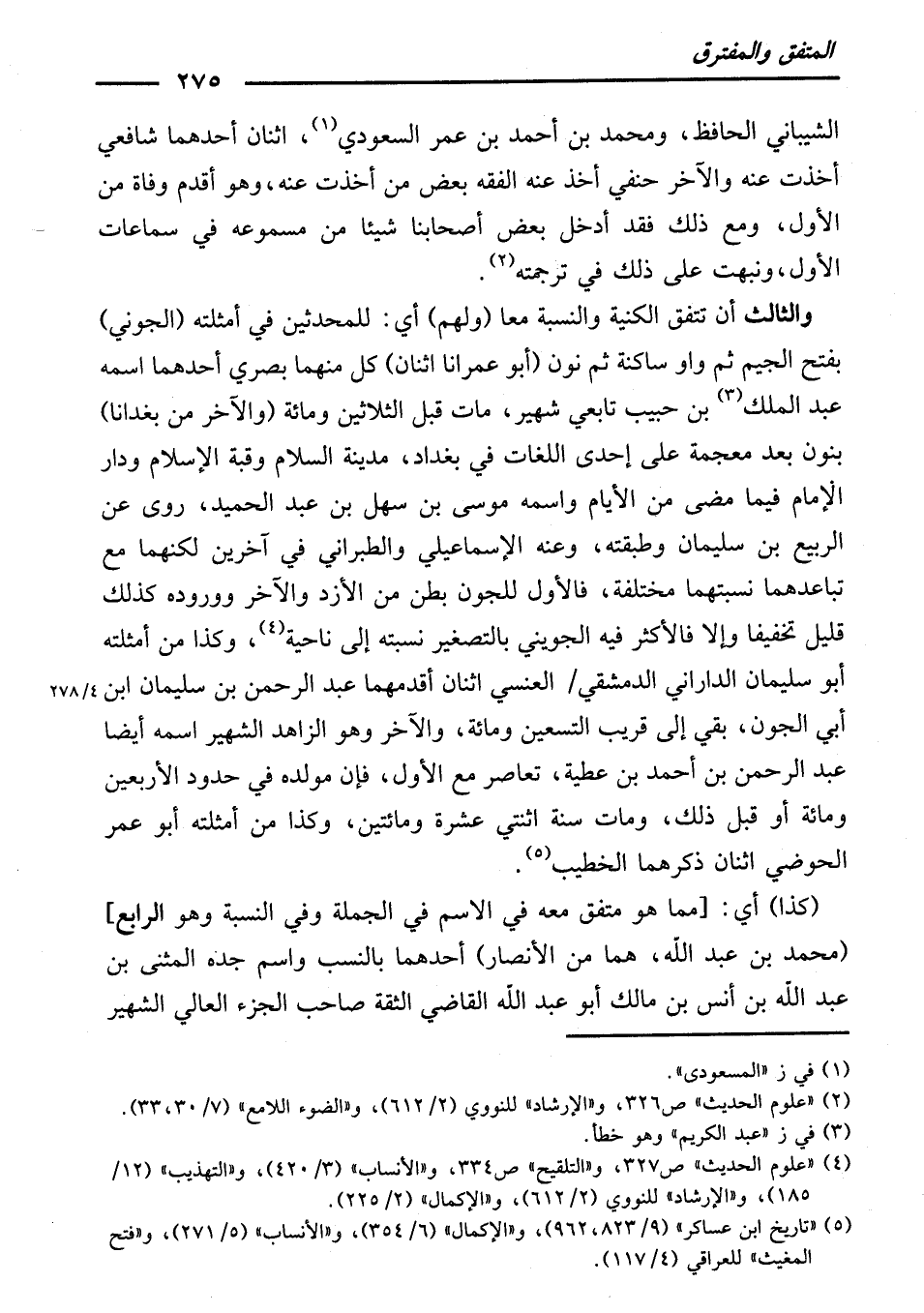 وَالثَّالِثُ: أَنْ تَتَّفِقَ الْكُنْيَةُ وَالنِّسْبَةُ مَعًا (وَلَهُمُ) أَيْ: لِلْمُحَدِّثِينَ فِي أَمْثِلَتِهِ (الْجَوْنِي) بِفَتْحِ الْجِيمِ ثُمَّ وَاوٍ سَاكِنَةٍ ثُمَّ نُونٍ (أَبُو عِمْرَانَا اثْنَانِ) كُلٌّ مِنْهُمَا بَصْرِيٌّ، أَحَدُهُمَا اسْمُهُ عَبْدُ الْمَلِكِ بْنُ حَبِيبٍ تَابِعِيٌّ شَهِيرٌ، مَاتَ قَبْلَ الثَّلَاثِينَ وَمِائَةٍ، (وَالْآخَرُ مِنْ بَغْدَانَا) بِنُونٍ بَعْدَ مُعْجَمَةٍ عَلَى إِحْدَى اللُّغَاتِ فِي بَغْدَادَ، مَدِينَةِ السَّلَامِ وَقُبَّةِ الْإِسْلَامِ وَدَارِ الْإِمَامِ فِيمَا مَضَى مِنَ الْأَيَّامِ، وَاسْمُهُ مُوسَى بْنُ سَهْلِ بْنِ عَبْدِ الْحَمِيدِ، رَوَى عَنِ الرَّبِيعِ بْنِ سُلَيْمَانَ وَطَبَقَتِهِ، وَعَنْهُ الْإِسْمَاعِيلِيُّ وَالطَّبَرَانِيُّ فِي آخَرِينَ، لَكِنَّهُمَا مَعَ تَبَاعُدِهِمَا نِسْبَتُهُمَا مُخْتَلِفَةٌ، فَالْأَوَّلُ لِلْجَوْنِ بَطْنٌ مَنِ الْأَزْدِ، وَالْآخَرُ وَوُرُودُهُ كَذَلِكَ قَلِيلٌ تَخْفِيفًا، وَإِلَّا فَالْأَكْثَرُ فِيهِ الْجُوَيْنِيُّ بِالتَّصْغِيرِ نِسْبَتُهُ إِلَى نَاجِيَةٍ، وَكَذَا مِنْ أَمْثِلَتِهِ أَبُو سُلَيْمَانَ الدَّارَانِيُّ الدِّمَشْقِيُّ الْعَنْسِيُّ اثْنَانِ، أَقْدَمُهُمَا عَبْدُ الرَّحْمَنِ بْنُ سُلَيْمَانَ بْنِ أَبِي الْجَوْنِ، بَقِيَ إِلَى قَرِيبِ التِّسْعِينَ وَمِائَةٍ، وَالْآخَرُ وَهُوَ الزَّاهِدُ الشَّهِيرُ، اسْمُهُ أَيْضًا عَبْدُ الرَّحْمَنِ بْنُ أَحْمَدَ بْنِ عَطِيَّةَ، تَعَاصَرَ مَعَ الْأَوَّلِ، فَإِنَّ مَوْلِدَهُ فِي حُدُودِ الْأَرْبَعِينَ وَمِائَةٍ أَوْ قَبْلَ ذَلِكَ، وَمَاتَ سَنَةَ اثْنَتَيْ عَشْرَةَ وَمِائَتَيْنِ، وَكَذَا مِنْ أَمْثِلَتِهِ أَبُو عُمَرَ الْحَوْضِيُّ اثْنَانِ، ذَكَرَهُمَا الْخَطِيبُ.