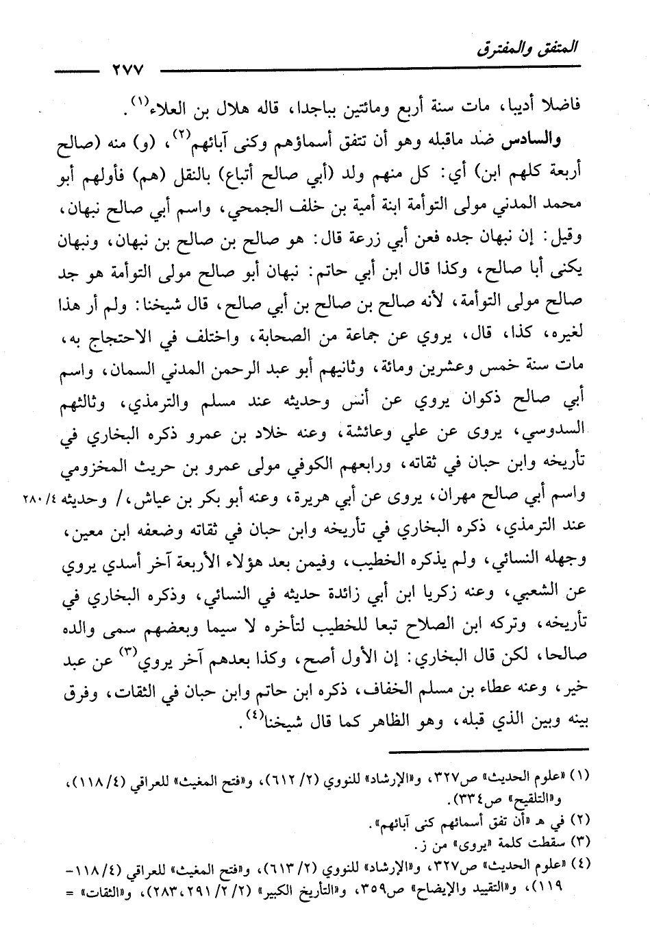 وَالسَّادِسُ ضِدُّ مَا قَبْلَهُ، وَهُوَ أَنْ تَتَّفِقَ أَسْمَاؤُهُمْ وَكُنَى آبَائِهِمْ، (وَ) مِنْهُ (صَالِحٌ أَرْبَعَةٌ كُلُّهُمُ ابْنُ) أَيْ: كُلٌّ مِنْهُمْ وَلَدُ (أَبِي صَالِحٍ اتْبَاعٌ) بِالنَّقْلِ (هُمُ) ، فَأَوَّلُهُمْ أَبُو مُحَمَّدٍ الْمَدَنِيُّ مَوْلَى التَّوْأَمَةِ ابْنَةِ أُمَيَّةَ بْنِ خَلَفٍ الْجُمَحِيِّ، وَاسْمُ أَبِي صَالِحٍ نَبْهَانُ، وَقِيلَ: إِنَّ نَبْهَانَ جَدُّهُ، فَعَنْ أَبِي زُرْعَةَ قَالَ: هُوَ صَالِحُ بْنُ صَالِحِ بْنِ نَبْهَانَ، وَنَبْهَانُ يُكَنَّى أَبَا صَالِحٍ. وَكَذَا قَالَ ابْنُ أَبِي حَاتِمٍ: نَبْهَانُ أَبُو صَالِحٍ مَوْلَى التَّوْأَمَةِ، هُوَ جَدُّ صَالِحٍ مَوْلَى التَّوْأَمَةِ ; لِأَنَّهُ صَالِحُ بْنُ صَالِحِ بْنِ أَبِي صَالِحٍ. قَالَ شَيْخُنَا: وَلَمْ أَرَ هَذَا لِغَيْرِهِ. كَذَا قَالَ يَرْوِي عَنْ جَمَاعَةٍ مِنَ الصَّحَابَةِ، وَاخْتُلِفَ فِي الِاحْتِجَاجِ بِهِ، مَاتَ سَنَةَ خَمْسٍ وَعِشْرِينَ وَمِائَةٍ، وَثَانِيهِمْ أَبُو عَبْدِ الرَّحْمَنِ الْمَدَنِيُّ السَّمَّانُ، وَاسْمُ أَبِي صَالِحٍ ذَكْوَانُ يَرْوِي عَنِ أَنَسٍ، وَحَدِيثُهُ عِنْدَ مُسْلِمٍ وَالتِّرْمِذِيِّ، وَثَالِثُهُمُ السَّدُوسِيُّ، يَرْوِي عَنْ عَلِيٍّ وَعَائِشَةَ، وَعَنْ خَلَّادِ بْنِ عَمْرٍو، ذَكَرَهُ الْبُخَارِيُّ فِي تَارِيخِهِ وَابْنُ حِبَّانَ فِي ثِقَاتِهِ، وَرَابِعُهُمُ الْكُوفِيُّ مَوْلَى عَمْرِو بْنِ حُرَيْثٍ الْمَخْزُومِيِّ، وَاسْمُ أَبِي صَالِحٍ مِهْرَانُ، يَرْوِي عَنْ أَبِي هُرَيْرَةَ، وَعَنْهُ أَبُو بَكْرِ بْنُ عَيَّاشَ، وَحَدِيثُهُ عِنْدَ التِّرْمِذِيِّ، ذَكَرَهُ الْبُخَارِيُّ فِي تَارِيخِهِ وَابْنُ حِبَّانَ فِي ثِقَاتِهِ، وَضَعَّفَهُ ابْنُ مَعِينٍ، وَجَهَّلَهُ النَّسَائِيُّ، وَلَمْ يَذْكُرْهُ الْخَطِيبُ، وَفِيمَنْ بَعْدَ هَؤُلَاءِ الْأَرْبَعَةِ آخَرُ أَسَدِيٌّ يَرْوِي عَنِ الشَّعْبِيِّ، وَعَنْهُ زَكَرِيَّا بْنُ أَبِي زَائِدَةَ، حَدِيثُهُ فِي النَّسَائِيِّ، وَذَكَرَهُ الْبُخَارِيُّ فِي تَارِيخِهِ، وَتَرَكَهُ ابْنُ الصَّلَاحِ تَبَعًا لِلْخَطِيبِ ; لِتَأَخُّرِهِ، لَا سِيَّمَا وَبَعْضُهُمْ سَمَّى وَالِدَهُ صَالِحًا، لَكِنْ قَالَ الْبُخَارِيُّ: إِنَّ الْأَوَّلَ أَصَحُّ. وَكَذَا بَعْدَهُمْ آخَرُ يَرْوِي عَنْ عَبْدِ خَيْرٍ، وَعَنْهُ عَطَاءُ بْنُ مُسْلِمٍ الْخَفَّافُ، ذَكَرَهُ ابْنُ أَبِي حَاتِمٍ وَابْنُ حِبَّانَ فِي الثِّقَاتِ، وَفَرَّقَ بَيْنَهُ وَبَيْنَ الَّذِي قَبْلَهُ، وَهُوَ الظَّاهِرُ كَمَا قَالَ شَيْخُنَا.