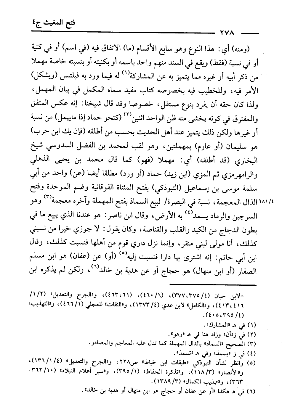 (وَمِنْهُ) أَيْ: هَذَا النَّوْعُ وَهُوَ سَابِعُ الْأَقْسَامِ (مَا) الِاتِّفَاقُ فِيهِ (فِي اسْمٍ) أَوْ فِي كُنْيَةٍ أَوْ فِي نِسْبَةٍ (فَقَطْ) وَيَقَعُ فِي السَّنَدِ مِنْهُمْ وَاحِدٌ بِاسْمِهِ أَوْ بِكُنْيَتِهِ أَوْ بِنِسْبَتِهِ خَاصَّةً مُهْمَلًا مِنْ ذِكْرِ أَبِيهِ أَوْ غَيْرِهِ مِمَّا يَتَمَيَّزُ بِهِ عَنِ الْمُشَارَكَةِ لَهُ فِيمَا وَرَدَ بِهِ فَيَلْتَبِسُ (وَيُشْكِلُ) مَرَّ فِيهِ، وَلِلْخَطِيبِ فِيهِ بِخُصُوصِهِ كِتَابٌ مُفِيدٌ سَمَّاهُ (الْمُكْمَلَ فِي بَيَانِ الْمُهْمَلِ) ; وَلِذَا كَانَ حَقُّهُ أَنْ يُفْرَدَ بِنَوْعٍ مُسْتَقِلٍّ خُصُوصًا، وَقَدْ قَالَ شَيْخُنَا: إِنَّهُ عَكْسُ الْمُتَّفِقِ وَالْمُفْتَرِقِ فِي كَوْنِهِ يُخْشَى مِنْهُ ظَنُّ الْوَاحِدِ اثْنَيْنِ، (كَنَحْوِ حَمَّادٍ إِذَا مَا يُهْمَلُ) مِنْ نِسْبَةٍ أَوْ غَيْرِهَا، وَلَكِنَّ ذَلِكَ يَتَمَيَّزُ عِنْدَ أَهْلِ الْحَدِيثِ بِحَسَبِ مَنْ أَطْلَقَهُ، (فَإِنْ يَكُ ابْنُ حَرْبٍ) هُوَ سُلَيْمَانُ (أَوْ عَارِمُ) بِمُهْمَلَتَيْنِ، وَهُوَ لَقَبٌ لِمُحَمَّدِ بْنِ الْفَضْلِ السَّدُوسِيِّ شَيْخِ الْبُخَارِيِّ (قَدْ أَطْلَقَهُ) أَيْ: مُهْمَلًا (فَهْوَ) كَمَا قَالَ مُحَمَّدُ بْنُ يَحْيَى الذُّهْلِيُّ وَالرَّامَهُرْمُزِيُّ ثُمَّ الْمِزِّيُّ (ابْنُ زَيْدٍ) حَمَّادٌ (أَوْ وَرَدْ) مُطْلَقًا أَيْضًا (عَنْ) وَاحِدٍ مِنْ أَبِي سَلَمَةَ مُوسَى بْنِ إِسْمَاعِيلَ (التَّبُوذَكِيِّ) بِفَتْحِ الْمُثَنَّاةِ الْفَوْقَانِيَّةِ وَضَمِّ الْمُوَحَّدَةِ وَفَتْحِ الذَّالِ الْمُعْجَمَةِ، نِسْبَةً فِي الْبَصْرَةِ ; لِبَيْعِ السَّمَاذِ، بِفَتْحِ الْمُهْمَلَةِ وَآخِرُهُ مُعْجَمَةٌ، وَهُوَ السَّرْجِينُ وَالرَّمَادُ يُسَمَّدُ بِهِ الْأَرْضُ.