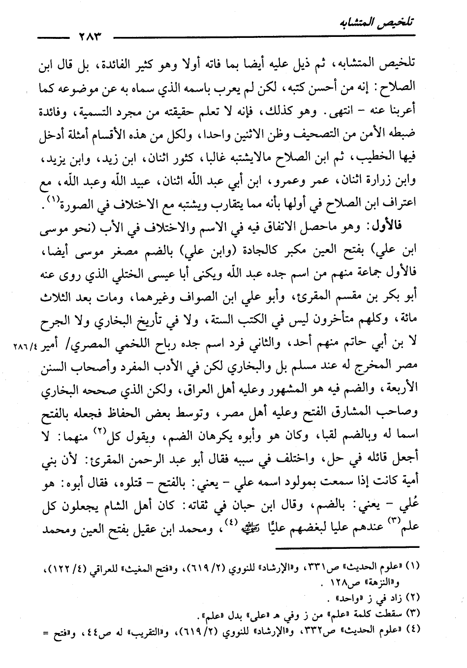(تَلْخِيصَ الْمُتَشَابِهِ) ، ثُمَّ ذَيَّلَ عَلَيْهِ أَيْضًا بِمَا فَاتَهُ أَوَّلًا وَهُوَ كَثِيرُ الْفَائِدَةِ، بَلْ قَالَ ابْنُ الصَّلَاحِ: إِنَّهُ مِنْ أَحْسَنِ كُتُبِهِ، لَكِنْ لَمْ يُعْرِبْ بِاسْمِهِ الَّذِي سَمَّاهُ بِهِ عَنْ مَوْضُوعِهِ كَمَا أَعْرَبْنَا عَنْهُ. انْتَهَى. وَهُوَ كَذَلِكَ فَإِنَّهُ لَا تُعْلَمُ حَقِيقَتُهُ مِنْ مُجَرَّدِ التَّسْمِيَةِ، وَفَائِدَةُ ضَبْطِهِ الْأَمْنُ مِنَ التَّصْحِيفِ وَظَنِّ الِاثْنَيْنِ وَاحِدًا، وَلِكُلٍّ مِنْ هَذِهِ الْأَقْسَامِ أَمْثِلَةٌ أَدْخَلَ فِيهَا الْخَطِيبُ، ثُمَّ ابْنُ الصَّلَاحِ مَا لَا يَشْتَبِهُ غَالِبًا، كَثَوْرٍ اثْنَانِ: ابْنُ زَيْدٍ، وَابْنُ يَزِيدَ، وَابْنُ زُرَارَةَ اثْنَانِ: عُمَرُ وَعَمْرٌو، وَابْنُ أَبِي عَبْدِ اللَّهِ اثْنَانِ: عُبَيْدُ اللَّهِ وَعَبْدُ اللَّهِ، مَعَ اعْتِرَافِ ابْنِ الصَّلَاحِ فِي أَوَّلِهَا بِأَنَّهُ مِمَّا يَتَقَارَبُ وَيَشْتَبِهُ مَعَ الِاخْتِلَافِ فِي الصُّورَةِ.