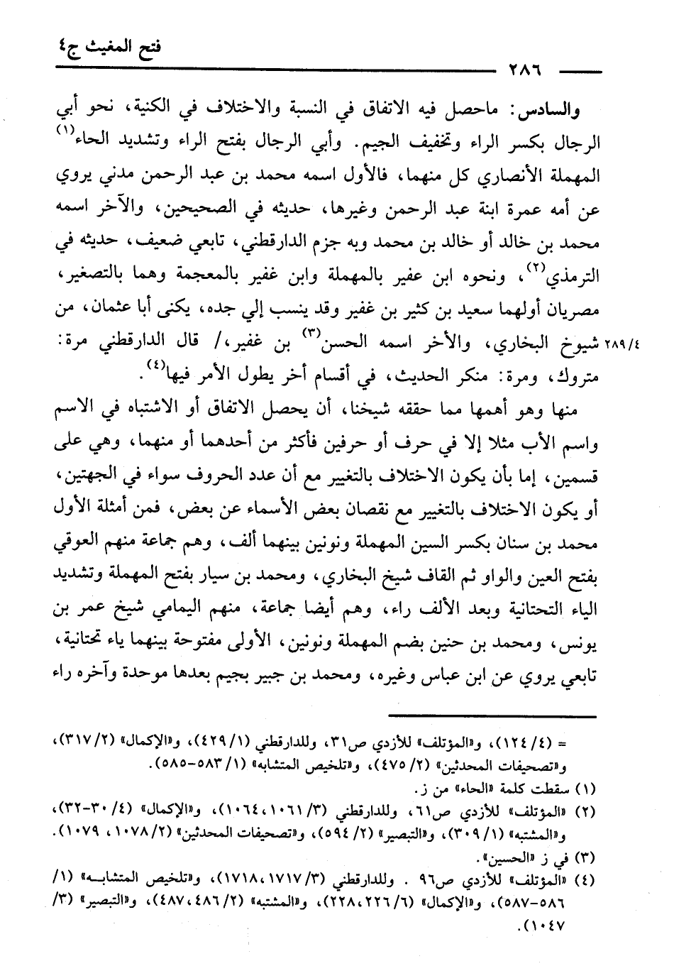 وَالسَّادِسُ: مَا حَصَلَ فِيهِ الِاتِّفَاقُ فِي النِّسْبَةِ، وَالِاخْتِلَافُ فِي الْكُنْيَةِ، نَحْوُ أَبِي الرِّجَاءِ بِكَسْرِ الرَّاءِ وَتَخْفِيفِ الْجِيمِ، وَأَبِي الرَّحَّالِ بِفَتْحِ الرَّاءِ وَتَشْدِيدِ الْحَاءِ الْمُهْمَلَةِ، الْأَنْصَارِيُّ كُلٌّ مِنْهُمَا، فَالْأَوَّلُ اسْمُهُ مُحَمَّدُ بْنُ عَبْدِ الرَّحْمَنِ مَدَنِيٌّ يَرْوِي عَنْ أُمِّهِ عَمْرَةَ ابْنَةِ عَبْدِ الرَّحْمَنِ وَغَيْرِهَا، حَدِيثُهُ فِي الصَّحِيحَيْنِ، وَالْآخَرُ اسْمُهُ مُحَمَّدُ بْنُ خَالِدٍ أَوْ خَالِدُ بْنُ مُحَمَّدٍ، وَبِهِ جَزَمَ الدَّارَقُطْنِيُّ، تَابِعِيٌّ ضَعِيفٌ حَدِيثُهُ فِي التِّرْمِذِيِّ، وَنَحْوُهُ ابْنُ عُفَيْرٍ بِالْمُهْمَلَةِ وَابْنُ غُفَيْرٍ بِالْمُعْجَمَةِ، وَهُمَا بِالتَّصْغِيرِ، مِصْرِيَّانِ ; أَوَّلُهُمَا سَعِيدُ بْنُ كَثِيرِ بْنِ عُفَيْرٍ، وَقَدْ يُنْسَبُ إِلَى جَدِّهِ، يُكَنَّى أَبَا عُثْمَانَ، مِنْ شُيُوخِ الْبُخَارِيِّ، وَالْآخَرُ اسْمُهُ الْحَسَنُ بْنُ غُفَيْرٍ، قَالَ الدَّارَقُطْنِيُّ مَرَّةً: مَتْرُوكٌ. وَمَرَّةً: مُنْكَرُ الْحَدِيثِ. فِي أَقْسَامٍ أُخَرَ يَطُولُ الْأَمْرُ فِيهَا.