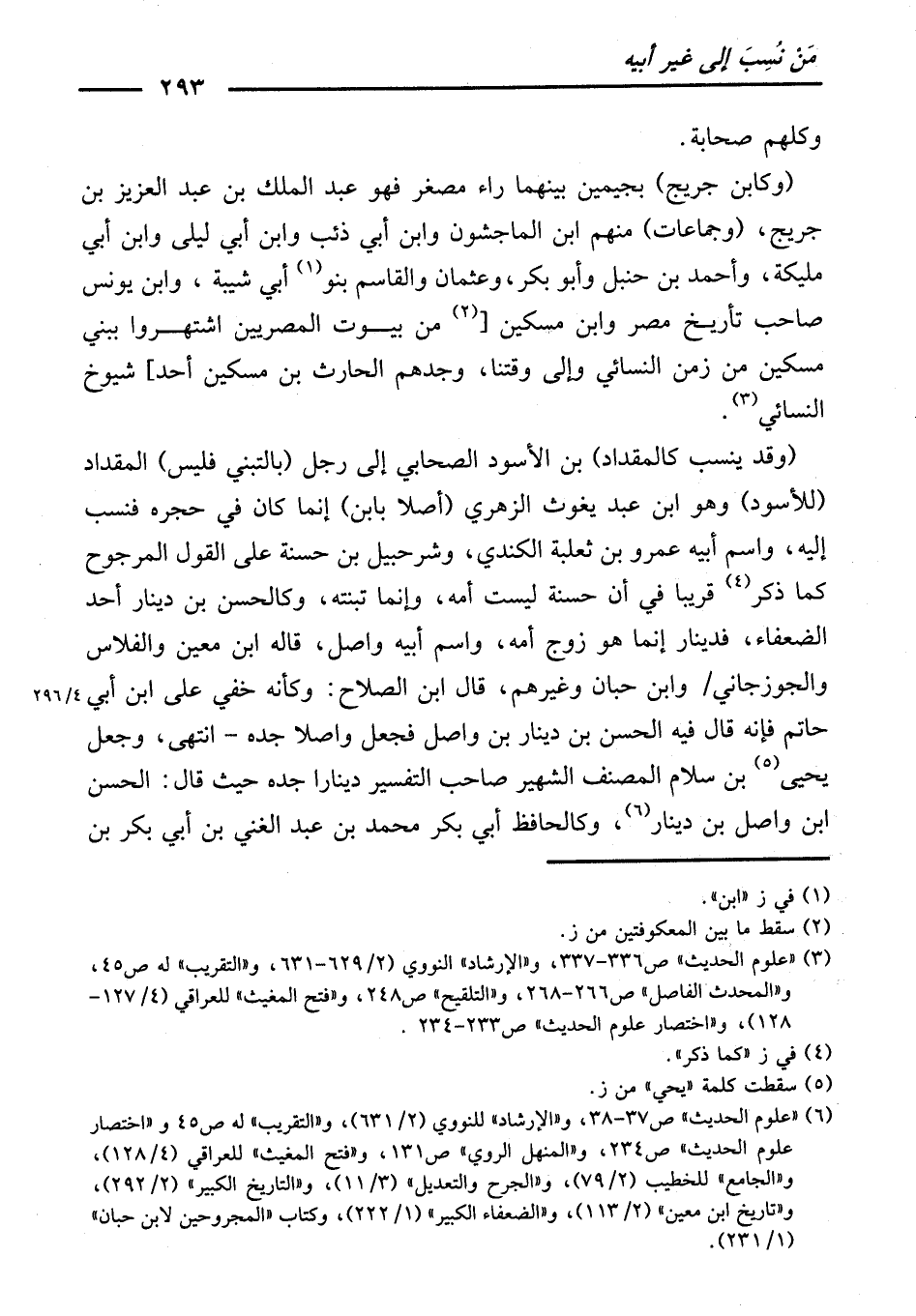 (وَكَابْنِ جُرَيْجٍ) بِجِيمَيْنِ بَيْنَهُمَا رَاءٌ، مُصَغَّرٌ، فَهُوَ عَبْدُ الْمَلِكِ بْنِ عَبْدِ الْعَزِيزِ بْنِ جُرَيْجٍ، (وَجَمَاعَاتٍ) مِنْهُمُ ابْنُ الْمَاجِشُونِ، وَابْنُ أَبِي ذِئْبٍ وَابْنُ أَبِي لَيْلَى وَابْنُ أَبِي مُلَيْكَةَ، وَأَحْمَدُ بْنُ حَنْبَلٍ وَأَبُو بَكْرٍ، وَعُثْمَانُ وَالْقَاسِمُ بَنُو أَبِي شَيْبَةَ، وَابْنُ يُونُسَ صَاحِبُ (تَارِيخِ مِصْرَ) وَابْنُ مِسْكِينٍ (مِنْ بُيُوتِ الْمِصْرِيِّينَ اشْتَهَرُوا بِبَنِي مِسْكِينٍ مِنْ زَمَنِ النَّسَائِيِّ وَإِلَى وَقْتِنَا، وَجَدُّهُمُ الْحَارِثُ بْنُ مِسْكِينٍ أَحَدُ شُيُوخِ النَّسَائِيِّ.