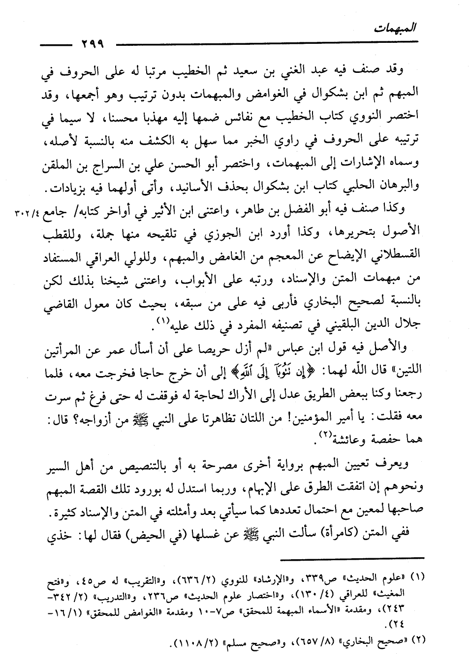 وَكَذَا صَنَّفَ فِيهِ أَبُو الْفَضْلِ بْنُ طَاهِرٍ، وَاعْتَنَى ابْنُ الْأَثِيرِ فِي أَوَاخِرَ كِتَابِهِ (جَامِعِ الْأُصُولِ) بِتَحْرِيرِهَا، وَكَذَا أَوْرَدَ ابْنُ الْجَوْزِيِّ فِي تَلْقِيحِهِ مِنْهَا جُمْلَةً، وَلِلْقُطْبِ الْقَسْطَلَّانِيِّ (الْإِيضَاحُ عَنِ الْمُعْجَمِ مِنَ الْغَامِضِ وَالْمُبْهَمِ) وَلِلْوَلِيِّ الْعِرَاقِيِّ (الْمُسْتَفَادُ مِنْ مُبْهَمَاتِ الْمَتْنِ وَالْإِسْنَادِ) ، وَرَتَّبَهُ عَلَى الْأَبْوَابِ، وَاعْتَنَى شَيْخُنَا بِذَلِكَ لَكِنْ بِالنِّسْبَةِ لِصَحِيحِ الْبُخَارِيِّ فَأَرْبَى فِيهِ عَلَى مَنْ سَبَقَهُ، بِحَيْثُ كَانَ مُعَوَّلُ الْقَاضِي جَلَالِ الدِّينِ الْبُلْقِينِيِّ فِي تَصْنِيفِهِ الْمُفْرَدِ فِي ذَلِكَ، عَلَيْهِ.