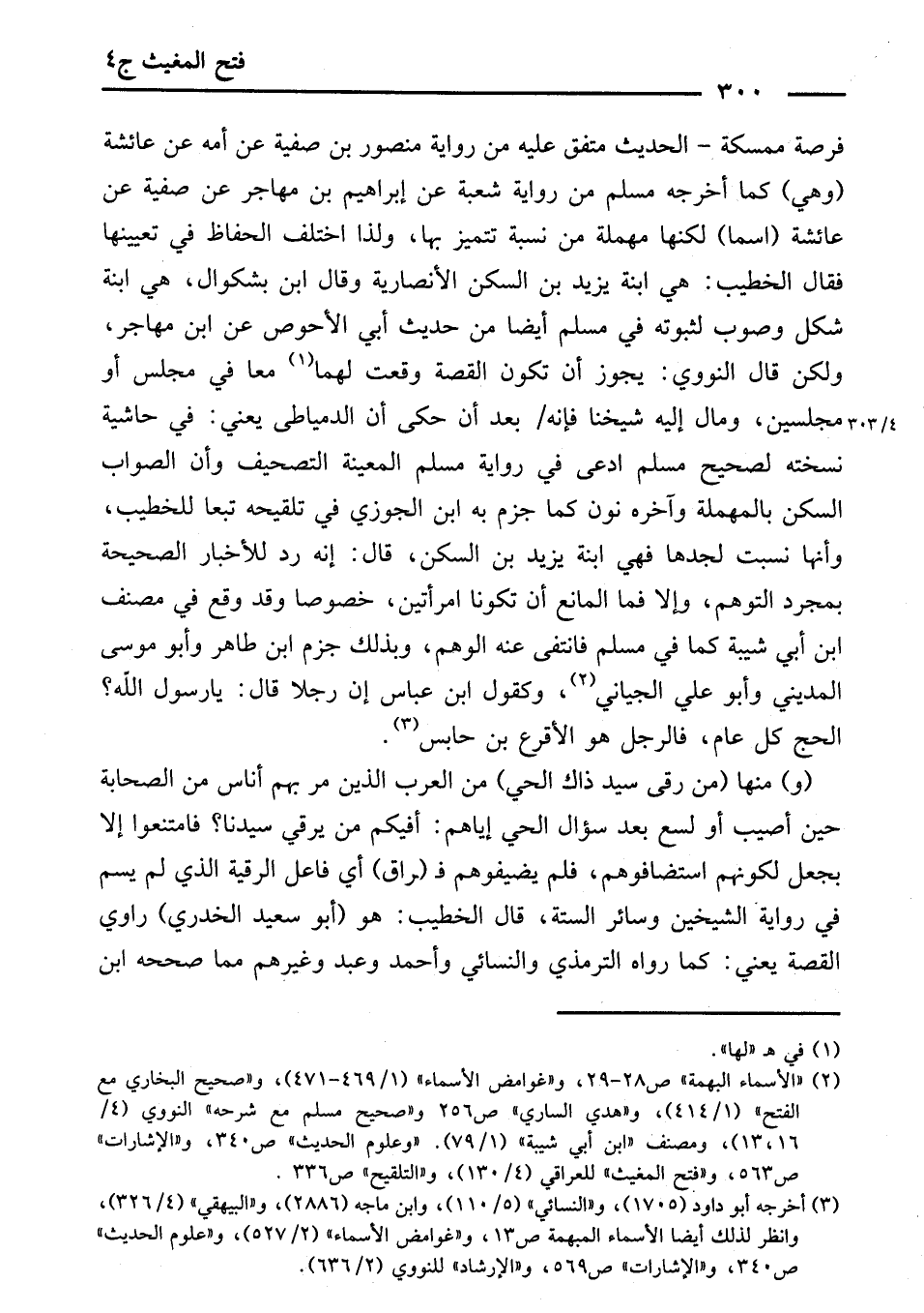 فِرْصَةً مُمَسَّكَةً) . . . الْحَدِيثَ. مُتَّفَقٌ عَلَيْهِ مِنْ رِوَايَةِ مَنْصُورِ بْنِ صَفِيَّةَ عَنِ أُمِّهِ، عَنْ عَائِشَةَ (وَهِيَ) كَمَا أَخْرَجَهُ مُسْلِمٌ مِنْ رِوَايَةِ شُعْبَةَ عَنْ إِبْرَاهِيمَ بْنِ مُهَاجِرٍ عَنْ صَفِيَّةَ، عَنْ عَائِشَةَ (أَسْمَا) ، لَكِنَّهَا مُهْمَلَةٌ مِنْ نِسْبَةٍ تَتَمَيَّزُ بِهَا ; وَلِذَا اخْتَلَفَ الْحُفَّاظُ فِي تَعْيِينِهَا فَقَالَ الْخَطِيبُ: هِيَ ابْنَةُ يَزِيدَ بْنَ السَّكَنِ الْأَنْصَارِيَّةُ، وَقَالَ ابْنُ بَشْكُوَالٍ: هِيَ ابْنَةُ شَكْلٍ. وَصُوِّبَ لِثُبُوتِهِ فِي مُسْلِمٍ أَيْضًا مِنْ حَدِيثِ أَبِي الْأَحْوَصِ عَنِ ابْنِ مُهَاجِرٍ، وَلَكِنْ قَالَ النَّوَوِيُّ: يَجُوزُ أَنْ تَكُونَ الْقِصَّةُ وَقَعَتْ لَهُمَا مَعًا فِي مَجْلِسٍ أَوْ مَجْلِسَيْنِ، وَمَالَ إِلَيْهِ شَيْخُنَا فَإِنَّهُ بَعْدَ أَنْ حَكَى أَنَّ الدِّمْيَاطِيَّ يَعْنِي فِي حَاشِيَةِ نُسْخَتِهِ لِصَحِيحِ مُسْلِمٍ ادَّعَى فِي رِوَايَةِ مُسْلِمٍ الْمُعَيَّنَةِ التَّصْحِيفَ، وَأَنَّ الصَّوَابَ السَّكَنُ بِالْمُهْمَلَةِ وَآخِرُهُ نُونٌ ; كَمَا جَزَمَ بِهِ ابْنُ الْجَوْزِيِّ فِي تَلْقِيحِهِ تَبَعًا لِلْخَطِيبِ، وَأَنَّهَا نُسِبَتْ لِجَدِّهَا فَهِيَ ابْنَةُ يَزِيدَ بْنِ السَّكَنِ، قَالَ: إِنَّهُ رَدٌّ لِلْأَخْبَارِ الصَّحِيحَةِ بِمُجَرَّدِ التَّوَهُّمِ، وَإِلَّا فَمَا الْمَانِعُ أَنْ تَكُونَا امْرَأَتَيْنِ، خُصُوصًا وَقَدْ وَقَعَ فِي مُصَنَّفِ ابْنِ أَبِي شَيْبَةَ كَمَا فِي مُسْلِمٍ، فَانْتَفَى عَنْهُ الْوَهْمُ، وَبِذَلِكَ جَزَمَ ابْنُ طَاهِرٍ وَأَبُو مُوسَى الْمَدِينِيُّ وَأَبُو عَلِيٍّ الْجَيَّانِيُّ، وَكَقَوْلِ ابْنِ عَبَّاسٍ: إِنَّ رَجُلًا قَالَ: يَا رَسُولَ اللَّهِ، الْحَجُّ كُلَّ عَامٍ؟ فَالرَّجُلُ هُوَ الْأَقْرَعُ بْنُ حَابِسٍ.