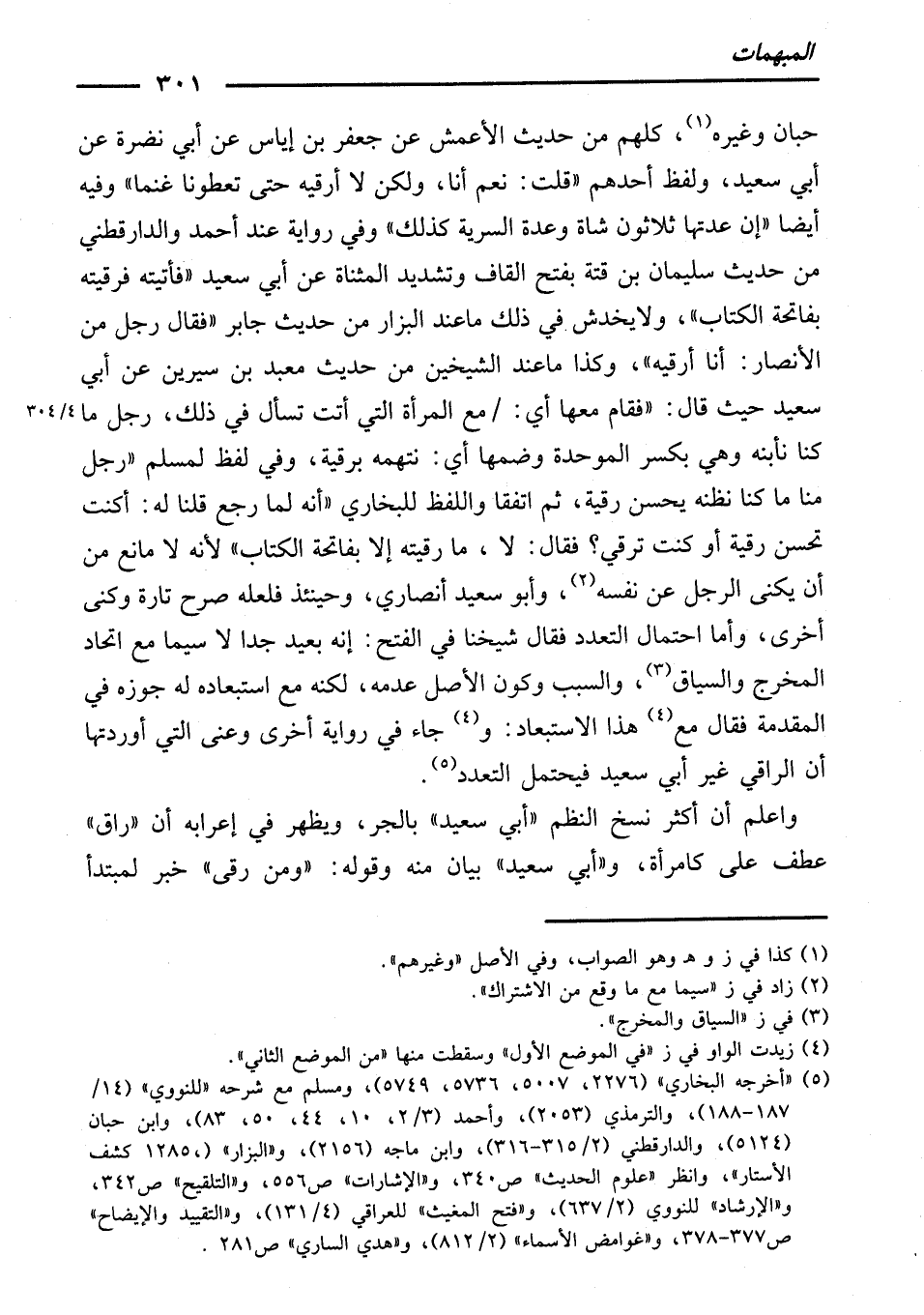 حِبَّانَ وَغَيْرُهُ، كُلُّهُمْ مِنْ حَدِيثِ الْأَعْمَشِ، عَنْ جَعْفَرِ بْنِ إِيَاسٍ، عَنْ أَبِي نَضْرَةَ، عَنْ أَبِي سَعِيدٍ، وَلَفْظُ أَحَدِهِمْ: (قُلْتُ: نَعَمْ أَنَا، وَلَكِنْ لَا أَرْقِيهِ حَتَّى تُعْطُونَا غَنَمًا) . وَفِيهِ أَيْضًا: (إِنَّ عِدَّتَهَا ثَلَاثُونَ شَاةً وَعِدَّةَ السَّرِيَّةِ كَذَلِكَ) . وَفِي رِوَايَةٍ عِنْدَ أَحْمَدَ وَالدَّارَقُطْنِيِّ مِنْ حَدِيثِ سُلَيْمَانَ بْنِ قَتَّةَ بِفَتْحِ الْقَافِ وَتَشْدِيدِ الْمُثَنَّاةِ، عَنْ أَبِي سَعِيدٍ: (فَأَتَيْتُهُ فَرَقَيْتُهُ بِفَاتِحَةِ الْكِتَابِ) . وَلَا يَخْدِشُ فِي ذَلِكَ مَا عِنْدَ الْبَزَّارِ مِنْ حَدِيثِ جَابِرٍ: (فَقَالَ رَجُلٌ مِنَ الْأَنْصَارِ: أَنَا أَرْقِيهِ) ، وَكَذَا مَا عِنْدَ الشَّيْخَيْنِ مِنْ حَدِيثِ مَعْبَدِ بْنِ سِيرِينَ عَنْ أَبِي سَعِيدٍ حَيْثُ قَالَ: (فَقَامَ مَعَهَا - أَيْ: مَعَ الْمَرْأَةِ الَّتِي أَتَتْ تَسْأَلُ فِي ذَلِكَ - رَجُلٌ مَا كُنَّا نَأْبِنُهُ، وَهِيَ بِكَسْرِ الْمُوَحَّدَةِ وَضَمِّهَا، أَيْ: نَتَّهِمُهُ - بِرُقْيَةٍ، وَفِي لَفْظٍ لِمُسْلِمٍ: رَجُلٌ مِنَّا مَا كُنَّا نَظُنُّهُ يُحْسِنُ رُقْيَةً، ثُمَّ اتَّفَقْنَا - وَاللَّفْظُ لِلْبُخَارِيِّ - (أَنَّهُ لَمَّا رَجَعَ قُلْنَا لَهُ: أَكُنْتَ تُحْسِنُ رُقْيَةً أَوْ كُنْتَ تَرْقِي؟ فَقَالَ: لَا، مَا رَقَيْتُهُ إِلَّا بِفَاتِحَةِ الْكِتَابِ) . لِأَنَّهُ لَا مَانِعَ مِنْ أَنْ يُكَنَّى الرَّجُلُ عَنْ نَفْسِهِ وَأَبُو سَعِيدٍ أَنْصَارِيٌّ، وَحِينَئِذٍ فَلَعَلَّهُ صَرَّحَ تَارَةً وَكَنَّى أُخْرَى، وَأَمَّا احْتِمَالُ التَّعَدُّدِ فَقَالَ شَيْخُنَا فِي الْفَتْحِ: إِنَّهُ بَعِيدٌ جِدًّا لَا سِيَّمَا مَعَ اتِّحَادِ الْمَخْرَجِ وَالسِّيَاقِ، وَالسَّبَبِ وَكَوْنِ الْأَصْلِ عَدَمَهُ، لَكِنَّهُ مَعَ اسْتِبْعَادِهِ لَهُ جَوَّزَهُ فِي الْمُقَدِّمَةِ فَقَالَ مَعَ هَذَا الِاسْتِبْعَادِ: وَجَاءَ فِي رِوَايَةٍ أُخْرَى وَعَنَى الَّتِي أَوْرَدْتُهَا أَنَّ الرَّاقِيَ غَيْرُ أَبِي سَعِيدٍ، فَيَحْتَمِلُ التَّعَدُّدَ.