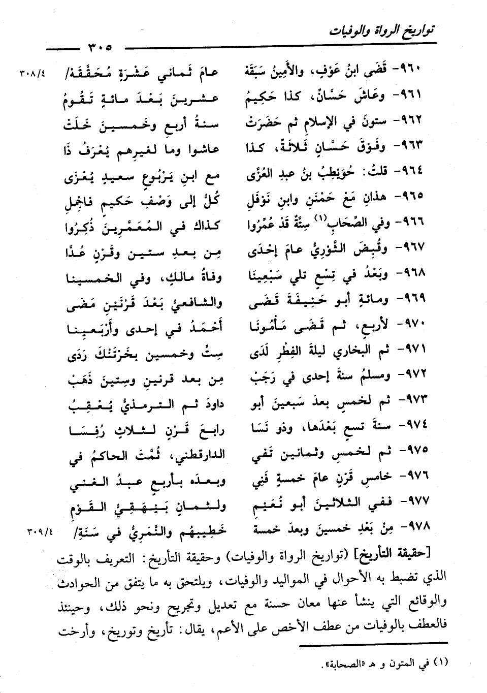 [حَقِيقَةُ التَّأْرِيخِ] (تَوَارِيخُ الرُّوَاةِ وَالْوَفَيَاتِ) وَحَقِيقَةُ التَّارِيخِ: التَّعْرِيفُ بِالْوَقْتِ الَّذِي تُضْبَطُ بِهِ الْأَحْوَالُ فِي الْمَوَالِيدِ وَالْوَفَيَاتِ، وَيَلْتَحِقُ بِهِ مَا يَتَّفِقُ مِنَ الْحَوَادِثِ وَالْوَقَائِعِ الَّتِي يَنْشَأُ عَنْهَا مَعَانٍ حَسَنَةٌ مَعَ تَعْدِيلٍ وَتَجْرِيحٍ وَنَحْوِ ذَلِكَ، وَحِينَئِذٍ فَالْعَطْفُ بِالْوَفَيَاتِ مِنْ عَطْفِ الْأَخَصِّ عَلَى الْأَعَمِّ، يُقَالُ: تَأْرِيخٌ وَتَوْرِيخٌ، وَأَرَّخْتُ