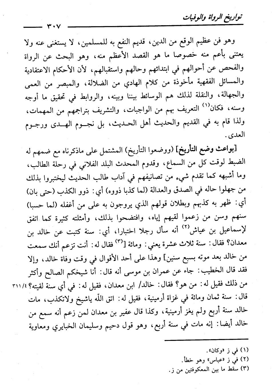[بَوَاعِثُ وَضْعِ التَّأْرِيخِ] (وَوَضَعُوا التَّأْرِيخَ) الْمُشْتَمِلَ عَلَى مَا ذَكَرْنَاهُ مَعَ ضَمِّهِمْ لَهُ الضَّبْطَ لِوَقْتِ كُلٍّ مِنَ السَّمَاعِ، وَقُدُومِ الْمُحَدِّثِ الْبَلَدَ الْفُلَانِيَّ فِي رِحْلَةِ الطَّالِبِ وَمَا أَشْبَهَهُ، كَمَا تَقَدَّمَ شَيْءٌ مِنْ تَصَانِيفِهِمْ فِي آدَابِ طَالِبِ الْحَدِيثِ ; لِيَخْتَبِرُوا بِذَلِكَ مَنْ جَهِلُوا حَالَهُ فِي الصِّدْقِ وَالْعَدَالَةِ، (لَمَّا كَذَبَا ذَوُوهُ) أَيْ: ذَوُو الْكَذِبِ، (حَتَّى بَانَ) أَيْ: ظَهَرَ بِهِ كَذِبُهُمْ وَبُطْلَانُ قَوْلِهِمُ الَّذِي يُرَوِّجُونَ بِهِ عَلَى مَنْ أَغْفَلَهُ، (لَمَّا حُسِبَا) سِنُّهُمْ وَسِنُّ مَنْ زَعَمُوا لُقْيَهُمْ إِيَّاهُ، وَافْتَضَحُوا بِذَلِكَ، وَأَمْثِلَتُهُ كَثِيرَةٌ كَمَا اتَّفَقَ لِإِسْمَاعِيلَ بْنِ عَيَّاشٍ أَنَّهُ سَأَلَ رَجُلًا اخْتِبَارًا: أَيُّ سَنَةٍ كَتَبْتَ عَنْ خَالِدِ بْنِ مَعْدَانَ؟ فَقَالَ: سَنَةَ ثَلَاثَ عَشْرَةَ. يَعْنِي: وَمِائَةٍ، (فَقَالَ لَهُ: أَنْتَ تَزْعُمُ أَنَّكَ سَمِعْتَ مِنْ خَالِدٍ بَعْدَ مَوْتِهِ بِسَبْعِ سِنِينَ) وَهَذَا عَلَى أَحَدِ الْأَقْوَالِ فِي وَقْتِ وَفَاةِ خَالِدٍ، وَإِلَّا فَقَدْ قَالَ الْخَطِيبُ: جَاءَ عَنْ عِمْرَانَ بْنِ مُوسَى أَنَّهُ قَالَ: أَنَا شَيْخُكُمُ الصَّالِحُ. وَأَكْثَرُ مِنْ ذَلِكَ فَقِيلَ لَهُ: مَنْ هُوَ؟ فَقَالَ: خَالِدُ بْنُ مَعْدَانَ. فَقِيلَ لَهُ: فِي أَيِّ سَنَةٍ لَقِيتَهُ؟ قَالَ: سَنَةَ ثَمَانٍ وَمِائَةٍ فِي غَزَاةِ أَرْمِينِيَّةَ. فَقِيلَ لَهُ: اتَّقِ اللَّهَ يَا شَيْخُ، وَلَا تَكْذِبْ، مَاتَ خَالِدٌ سَنَةَ أَرْبَعٍ وَلَمْ يَغْزُ أَرْمِينِيَّةَ) وَكَذَا قَالَ عُفَيْرُ بْنُ مَعْدَانَ لِمَنْ زَعَمَ أَنَّهُ سَمِعَ مِنْ خَالِدٍ أَيْضًا: إِنَّهُ مَاتَ فِي سَنَةِ أَرْبَعٍ، وَهُوَ قَوْلُ دُحَيْمٍ وَسُلَيْمَانَ الْخَبَايِرِيِّ وَمُعَاوِيَةَ