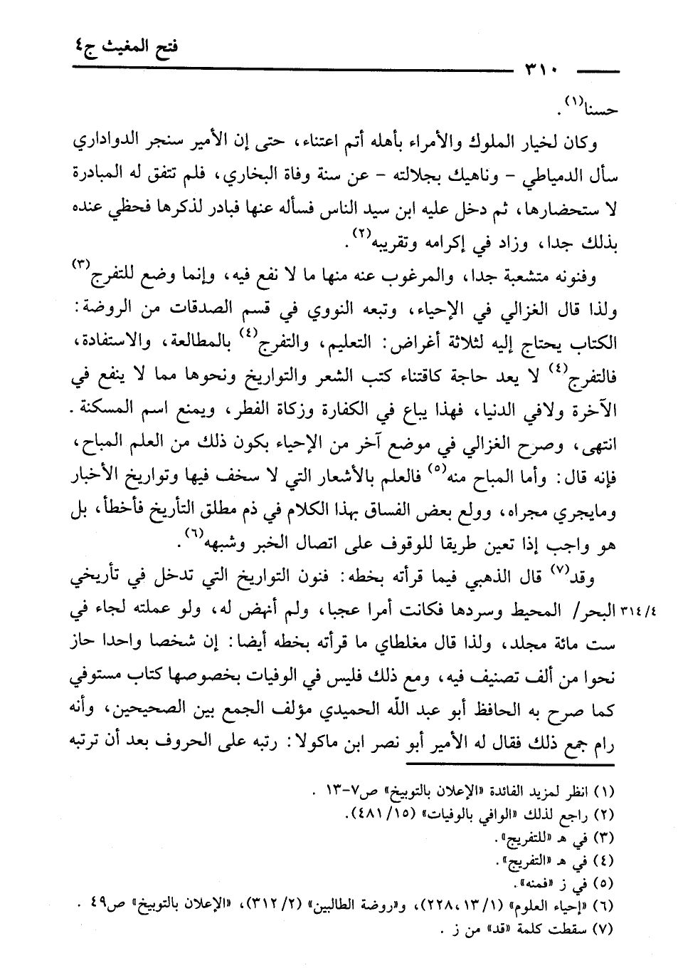 وَصَرَّحَ الْغَزَالِيُّ فِي مَوْضِعٍ آخَرَ مِنَ الْإِحْيَاءِ بِكَوْنِ ذَلِكَ مِنَ الْعِلْمِ الْمُبَاحِ ; فَإِنَّهُ قَالَ: وَأَمَّا الْمُبَاحُ مِنْهُ فَالْعِلْمُ بِالْأَشْعَارِ الَّتِي لَا سَخْفَ فِيهَا، وَتَوَارِيخُ الْأَخْبَارِ وَمَا يَجْرِي مَجْرَاهُ، وَوَلِعَ بَعْضُ الْفُسَّاقِ بِهَذَا الْكَلَامِ فِي ذَمِّ مُطْلَقِ التَّارِيخِ فَأَخْطَأَ، بَلْ هُوَ وَاجِبٌ إِذَا تَعَيَّنَ طَرِيقًا لِلْوُقُوفِ عَلَى اتِّصَالِ الْخَبَرِ وَشِبْهِهِ.
