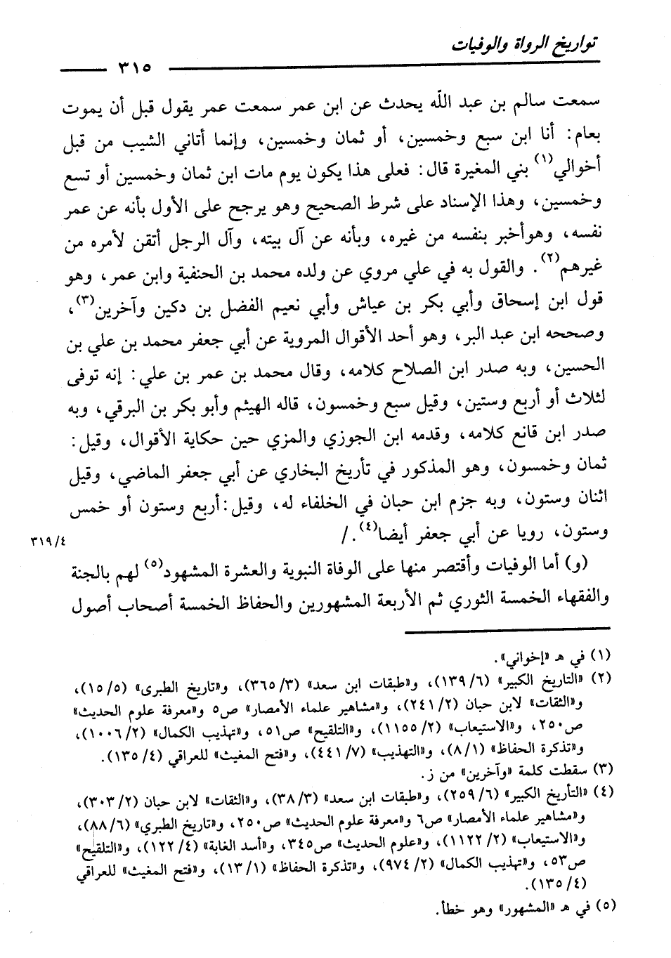 (وَ) أَمَّا الْوَفَيَاتُ وَاقْتَصَرَ مِنْهَا عَلَى الْوَفَاةِ النَّبَوِيَّةِ وَالْعَشَرَةِ الْمَشْهُودِ لَهُمْ بِالْجَنَّةِ وَالْفُقَهَاءِ الْخَمْسَةِ، الثَّوْرِيِّ، ثُمَّ الْأَرْبَعَةِ الْمَشْهُورِينَ وَالْحُفَّاظِ الْخَمْسَةِ أَصْحَابِ أُصُولِ