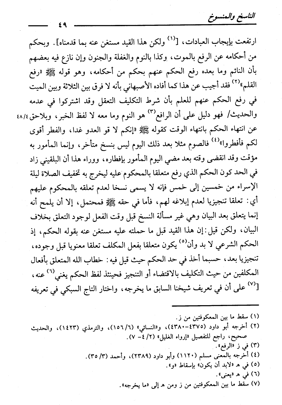 ارْتَفَعَتْ بِإِيجَابِ الْعِبَادَاتِ. وَلَكِنَّ هَذَا الْقَيْدَ مُسْتَغْنٍ عَنْهُ بِمَا قَدَّمْنَاهُ. وَبِحُكْمٍ مِنْ أَحْكَامِهِ عَنِ الرَّفْعِ بِالْمَوْتِ، وَكَذَا بِالنَّوْمِ وَالْغَفْلَةِ وَالْجُنُونِ، وَإِنْ نَازَعَ فِيهِ بَعْضُهُمْ بِأَنَّ النَّائِمَ وَمَا بَعْدَهُ رُفِعَ الْحُكْمُ عَنْهُمْ بِحُكْمٍ مِنْ أَحْكَامِهِ، وَهُوَ قَوْلُهُ - صَلَّى اللَّهُ عَلَيْهِ وَسَلَّمَ -: ( «رُفِعَ الْقَلَمُ» ) ; فَقَدْ أُجِيبَ عَنْ هَذَا كَمَا أَفَادَهُ الْأَصْبَهَانِيُّ بِأَنَّهُ لَا فَرْقَ بَيْنَ الثَّلَاثَةِ وَبَيْنَ الْمَيِّتِ فِي رَفْعِ الْحُكْمِ عَنْهُمْ ; لِلْعِلْمِ بِأَنَّ شَرْطَ التَّكْلِيفِ التَّعَقُّلُ، وَقَدِ اشْتَرَكُوا فِي عَدَمِهِ. وَالْحَدِيثُ فَهُوَ دَلِيلٌ عَلَى أَنَّ الرَّافِعَ هُوَ النَّوْمُ وَمَا مَعَهُ، لَا لَفْظُ الْخَبَرِ. وَبِلَاحِقٍ عَنِ انْتِهَاءِ الْحُكْمِ بِانْتِهَاءِ الْوَقْتِ ; كَقَوْلِهِ - صَلَّى اللَّهُ عَلَيْهِ وَسَلَّمَ -: ( «إِنَّكُمْ لَاقُو الْعَدُوِّ غَدًا، وَالْفِطْرُ أَقْوَى لَكُمْ فَأَفْطِرُوا» ) . فَالصَّوْمُ مَثَلًا بَعْدَ ذَلِكَ الْيَوْمِ لَيْسَ بِنَسْخٍ مُتَأَخِّرٍ، وَإِنَّمَا الْمَأْمُورُ بِهِ مُؤَقَّتٌ، وَقَدِ انْقَضَى وَقْتُهُ بَعْدَ مُضِيِّ الْيَوْمِ الْمَأْمُورِ بِإِفْطَارِهِ. وَوَرَاءَ هَذَا أَنَّ الْبُلْقِينِيَّ زَادَ فِي الْحَدِّ كَوْنَ الْحُكْمِ الَّذِي رُفِعَ مُتَعَلِّقًا بِالْمَحْكُومِ عَلَيْهِ ; لِيُخْرِجَ بِهِ تَخْفِيفُ الصَّلَاةِ لَيْلَةَ الْإِسْرَاءِ مِنْ خَمْسِينَ إِلَى خَمْسٍ ; فَإِنَّهُ لَا يُسَمَّى نَسْخًا ; لِعَدَمِ تَعَلُّقِهِ بِالْمَحْكُومِ عَلَيْهِمْ، أَيْ: تَعَلُّقًا تَنْجِيزِيًّا ; لِعَدَمِ إِبْلَاغِهِ لَهُمْ. فَأَمَّا فِي حَقِّهِ - صَلَّى اللَّهُ عَلَيْهِ وَسَلَّمَ - فَمُحْتَمَلٌ، إِلَّا أَنْ يُلْمَحَ أَنَّهُ إِنَّمَا يَتَعَلَّقُ بَعْدَ الْبَيَانِ، وَهِيَ غَيْرُ مَسْأَلَةِ النَّسْخِ قَبْلَ وَقْتِ الْفِعْلِ ; لِوُجُودِ التَّعَلُّقِ بِخِلَافِ الْبَيَانِ.