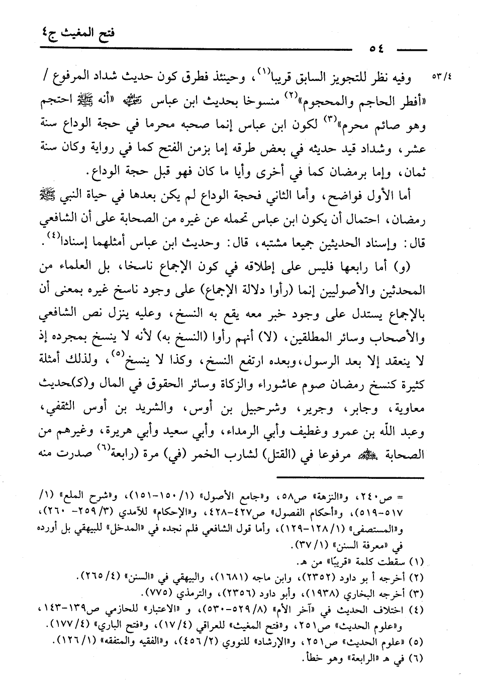 وَفِيهِ نَظَرٌ لِلتَّجْوِيزِ السَّابِقِ قَرِيبًا. وَحِينَئِذٍ فَطُرُقُ كَوْنِ حَدِيثِ شَدَّادٍ الْمَرْفُوعِ: ( «أَفْطَرَ الْحَاجِمُ وَالْمَحْجُومُ» ) مَنْسُوخًا بِحَدِيثِ ابْنِ عَبَّاسٍ رَضِيَ اللَّهُ عَنْهُ: (أَنَّهُ - صَلَّى اللَّهُ عَلَيْهِ وَسَلَّمَ - احْتَجَمَ وَهُوَ صَائِمٌ مُحْرِمٌ) ; لِكَوْنِ ابْنِ عَبَّاسٍ إِنَّمَا صَحِبَهُ مُحْرِمًا فِي حَجَّةِ الْوَدَاعِ سَنَةَ عَشْرٍ، وَشَدَّادٌ قُيِّدَ حَدِيثُهُ فِي بَعْضِ طُرُقِهِ ; إِمَّا بِزَمَنِ الْفَتْحِ كَمَا فِي رِوَايَةٍ، وَكَانَ سَنَةَ ثَمَانٍ، وَإِمَّا بِرَمَضَانَ كَمَا فِي أُخْرَى، وَأَيًّا مَا كَانَ فَهُوَ قَبْلَ حَجَّةِ الْوَدَاعِ.