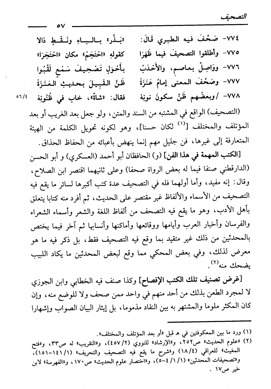 (التَّصْحِيفُ) الْوَاقِعُ فِي الْمُشْتَبِهِ مِنَ السَّنَدِ وَالْمَتْنِ. وَلَوْ جُعِلَ بَعْدَ الْغَرِيبِ أَوْ بَعْدَ الْمُؤْتَلِفِ وَالْمُخْتَلِفِ لَكَانَ حَسَنًا، وَهُوَ لِكَوْنِهِ تَحْوِيلَ الْكَلِمَةِ مِنَ الْهَيْئَةِ الْمُتَعَارَفَةِ إِلَى غَيْرِهَا فَنٌّ جَلِيلٌ مُهِمٌّ، إِنَّمَا يَنْهَضُ بِأَعْبَائِهِ مِنَ الْحُفَّاظِ الْحُذَّاقُ.