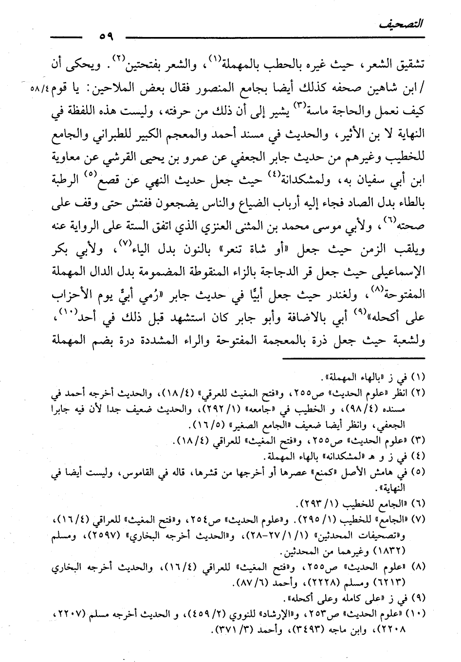 وَيُحْكَى أَنَّ ابْنَ شَاهِينَ صَحَّفَهُ كَذَلِكَ أَيْضًا بِجَامِعِ الْمَنْصُورِ، فَقَالَ بَعْضُ الْمَلَّاحِينَ: يَا قَوْمُ، كَيْفَ نَعْمَلُ وَالْحَاجَةُ مَاسَّةٌ؟ يُشِيرُ إِلَى أَنَّ ذَلِكَ مِنْ حِرْفَتِهِ، وَلَيْسَتْ هَذِهِ اللَّفْظَةُ فِي النِّهَايَةِ لِابْنِ الْأَثِيرِ. وَالْحَدِيثُ فِي مُسْنَدِ أَحْمَدَ وَ (الْمُعْجَمِ الْكَبِيرِ) لِلطَّبَرَانِيِّ وَ (الْجَامِعِ) لِلْخَطِيبِ وَغَيْرِهِمْ مِنْ حَدِيثِ جَابِرٍ الْجُعْفِيِّ عَنْ عَمْرِو بْنِ يَحْيَى الْقُرَشِيِّ، عَنْ مُعَاوِيَةَ بْنِ أَبِي سُفْيَانَ بِهِ. وَلِمُشْكَدَانَةَ حَيْثُ جَعَلَ حَدِيثَ النَّهْيِ عَنْ قَصْعِ الرُّطَبَةِ بِالطَّاءِ بَدَلَ الصَّادِ، فَجَاءَ إِلَيْهِ أَرْبَابُ الضِّيَاعِ وَالنَّاسِ يَضِجُّونَ، فَفَتَّشَ حَتَّى وَقَفَ عَلَى صِحَّتِهِ. وَلِأَبِي مُوسَى مُحَمَّدِ بْنِ الْمُثَنَّى الْعَنَزِيِّ الَّذِي اتَّفَقَ السِّتَّةُ عَلَى الرِّوَايَةِ عَنْهُ، وَيُلَقَّبُ الزَّمَنَ ; حَيْثُ جَعَلَ (أَوْ شَاةٌ تَنْعَرُ) بِالنُّونِ بَدَلَ الْيَاءِ. وَلِأَبِي بَكْرٍ الْإِسْمَاعِيلِيِّ، حَيْثُ جَعَلَ قَرَّ الدَّجَاجَةِ بِالزَّاءِ الْمَنْقُوطَةِ الْمَضْمُومَةِ بَدَلَ الدَّالِ الْمُهْمَلَةِ الْمَفْتُوحَةِ.