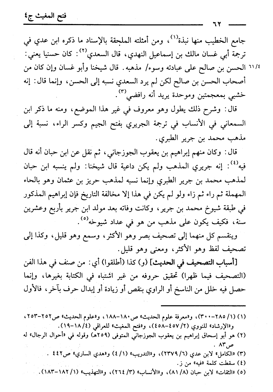 قَالَ شَيْخُنَا: وَلَمْ يَنْسُبْهُ ابْنُ حِبَّانَ لِمَذْهَبِ مُحَمَّدِ بْنِ جَرِيرٍ الطَّبَرِيِّ، وَإِنَّمَا نَسَبَهُ لِمَذْهَبِ حَرِيرِ بْنِ عُثْمَانَ، وَهُوَ بِالْحَاءِ الْمُهْمَلَةِ ثُمَّ رَاءٍ ثُمَّ رَاءٍ. وَلَوْ لَمْ يَكُنْ فِي هَذَا إِلَّا مُخَالَفَةُ التَّارِيخِ ; فَإِنَّ إِبْرَاهِيمَ الْمَذْكُورَ فِي طَبَقَةِ شُيُوخِ مُحَمَّدِ بْنِ جَرِيرٍ، وَكَانَتْ وَفَاتُهُ بَعْدَ مَوْلِدِ ابْنِ جَرِيرٍ بِأَرْبَعٍ وَعِشْرِينَ سَنَةً، فَكَيْفَ يَكُونُ عَلَى مَذْهَبِ مَنْ هُوَ فِي عِدَادِ شُيُوخِهِ؟ ! وَيَنْقَسِمُ كُلٌّ مِنْهُمَا إِلَى تَصْحِيفِ بَصَرٍ، وَهُوَ الْأَكْثَرُ، وَسَمْعٍ، وَهُوَ قَلِيلٌ. وَكَذَا إِلَى تَصْحِيفِ لَفْظٍ، وَهُوَ الْأَكْثَرُ، وَمَعْنًى، وَهُوَ قَلِيلٌ.