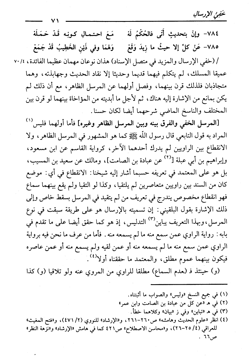 [الْمُرْسَلُ الْخَفِيُّ وَالْفَرْقُ بَيْنَهُ وَبَيْنَ الْمُرْسَلِ الظَّاهِرِ وَغَيْرِهِ] فَأَمَّا أَوَّلُهُمَا، فَلَيْسَ الْمُرَادُ بِهِ قَوْلَ التَّابِعِيِّ: قَالَ رَسُولُ اللَّهِ - صَلَّى اللَّهُ عَلَيْهِ وَسَلَّمَ - كَمَا هُوَ الْمَشْهُورُ فِي الْمُرْسَلِ الظَّاهِرِ، وَلَا الِانْقِطَاعَ بَيْنَ الرَّاوِيَيْنِ لَمْ يُدْرِكْ أَحَدُهُمَا الْآخَرَ ; كَرِوَايَةِ الْقَاسِمِ عَنِ ابْنِ مَسْعُودٍ، وَإِبْرَاهِيمَ بْنِ أَبِي عَبْلَةَ عَنْ عُبَادَةَ بْنِ الصَّامِتِ، وَمَالِكٍ عَنْ سَعِيدِ بْنِ الْمُسَيَّبِ. بَلْ هُوَ عَلَى الْمُعْتَمَدِ فِي تَعْرِيفِهِ حَسْبَمَا أَشَارَ إِلَيْهِ شَيْخُنَا: الِانْقِطَاعُ فِي أَيِّ مَوْضِعٍ كَانَ مِنَ السَّنَدِ بَيْنَ رَاوِيَيْنِ مُتَعَاصِرَيْنِ لَمْ يَلْتَقِيَا، وَكَذَا لَوِ الْتَقَيَا وَلَمْ يَقَعْ بَيْنَهُمَا سَمَاعٌ فَهُوَ انْقِطَاعٌ مَخْصُوصٌ، يَنْدَرِجُ فِي تَعْرِيفِهِ مَنْ لَمْ يَتَقَيَّدْ فِي الْمُرْسَلِ بِسَقْطٍ خَاصٍّ.
