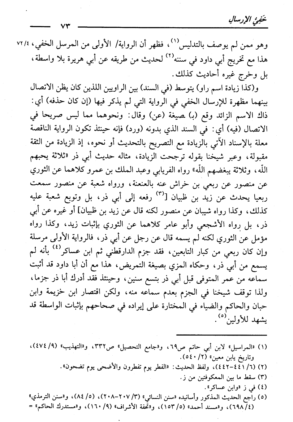 وَ (كَذَا زِيَادَةُ اسْمِ رَاوٍ) يَتَوَسَّطُ (فِي السَّنَدْ) بَيْنَ الرَّاوِيَيْنِ اللَّذَيْنِ كَانَ يُظَنُّ الِاتِّصَالُ بَيْنَهُمَا مَظْهَرَةً لِلْإِرْسَالِ الْخَفِيِّ فِي الرِّوَايَةِ الَّتِي لَمْ يُذْكَرْ فِيهَا (إِنْ كَانَ حَذْفُهُ) ; أَيْ: ذَاكَ الِاسْمِ الزَّائِدِ وَقَعَ (بِـ) صِيغَةِ (عَنْ) . وَقَالَ: وَنَحْوُهُمَا مِمَّا لَيْسَ صَرِيحًا فِي الِاتِّصَالِ (فِيهِ) ; أَيْ: فِي السَّنَدِ الَّذِي بِدُونِهِ (وَرَدْ) ; فَإِنَّهُ حِينَئِذٍ تَكُونُ الرِّوَايَةُ النَّاقِصَةُ مُعَلَّةٌ بِالْإِسْنَادِ الْآتِي بِالزِّيَادَةِ مَعَ التَّصْرِيحِ بِالتَّحْدِيثِ أَوْ نَحْوِهِ ; إِذِ الزِّيَادَةُ مِنَ الثِّقَةِ مَقْبُولَةٌ. وَعَبَّرَ شَيْخُنَا بِقَوْلِهِ: تَرَجَّحَتِ الزِّيَادَةُ. مِثَالُهُ حَدِيثُ أَبِي ذَرٍّ: ( «ثَلَاثَةٌ يُحِبُّهُمُ اللَّهُ، وَثَلَاثَةٌ يُبْغِضُهُمُ اللَّهُ» ) . رَوَاهُ الْفِرْيَابِيُّ وَعَبْدُ الْمَلِكِ بْنُ عَمْرٍو، وَكِلَاهُمَا عَنِ الثَّوْرِيِّ، عَنْ مَنْصُورٍ، عَنْ رِبْعِيِّ بْنِ خِرَاشٍ عَنْهُ بِالْعَنْعَنَةِ. وَرَوَاهُ شُعْبَةُ عَنْ مَنْصُورٍ: سَمِعْتُ رِبْعِيًّا يُحَدِّثُ عَنْ زَيْدِ بْنِ ظَبْيَانَ رَفَعَهُ إِلَى أَبِي ذَرٍّ. بَلْ وَتُوبِعَ شُعْبَةُ عَلَيْهِ كَذَلِكَ. وَكَذَا رَوَاهُ شَيْبَانُ عَنْ مَنْصُورٍ، لَكِنَّهُ قَالَ: عَنْ زَيْدِ بْنِ ظَبْيَانَ أَوْ غَيْرِهِ، عَنْ أَبِي ذَرٍّ. بَلْ رَوَاهُ الْأَشْجَعِيُّ وَأَبُو عَامِرٍ، كِلَاهُمَا عَنِ الثَّوْرِيِّ بِإِثْبَاتِ زَيْدٍ. وَكَذَا رَوَاهُ مُؤَمَّلٌ عَنِ الثَّوْرِيِّ، لَكِنَّهُ لَمْ يُسَمِّهِ، قَالَ: عَنْ رَجُلٍ عَنْ أَبِي ذَرٍّ. فَالرِّوَايَةُ الْأُولَى مُرْسَلَةٌ وَإِنْ كَانَ رِبْعِيٌّ مِنْ كِبَارِ التَّابِعِينَ ; فَقَدْ جَزَمَ الدَّارَقُطْنِيُّ ثُمَّ ابْنُ عَسَاكِرَ بِأَنَّهُ لَمْ يَسْمَعْ مِنْ أَبِي ذَرٍّ. وَحَكَاهُ الْمِزِّيُّ بِصِيغَةِ التَّمْرِيضِ، هَذَا مَعَ أَنَّ أَبَا دَاوُدَ قَدْ أَثْبَتَ سَمَاعَهُ مِنْ عُمَرَ الْمُتَوَفَّى قَبْلَ أَبِي ذَرٍّ بِتِسْعِ سِنِينَ، وَحِينَئِذٍ فَقَدْ أَدْرَكَ أَبَا ذَرٍّ جَزْمًا ; وَلِذَا تَوَقَّفَ شَيْخُنَا فِي الْجَزْمِ بِعَدَمِ سَمَاعِهِ مِنْهُ. وَلَكِنَّ اقْتِصَارَ ابْنِ خُزَيْمَةَ وَابْنِ حِبَّانَ وَالْحَاكِمِ وَالضِّيَاءِ فِي (الْمُخْتَارَةِ) عَلَى إِيرَادِهِ فِي صِحَاحِهِمْ بِإِثْبَاتِ الْوَاسِطَةِ قَدْ يَشْهَدُ لِلْأَوَّلَيْنِ.