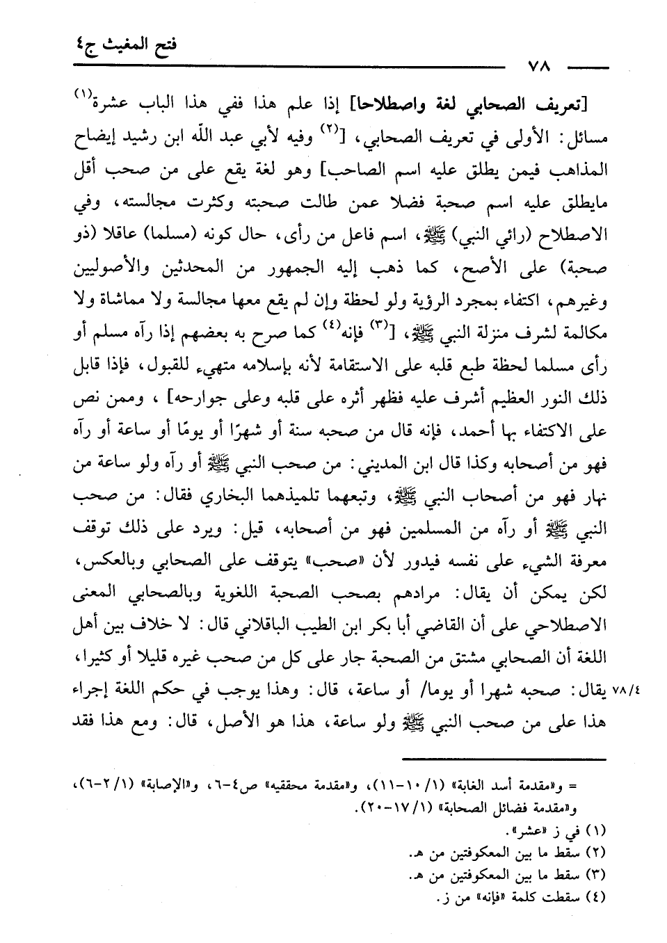 الْأُولَى: فِي تَعْرِيفِ الصَّحَابِيِّ. وَفِيهِ لِأَبِي عَبْدِ اللَّهِ بْنِ رُشَيْدٍ: (إِيضَاحُ الْمَذَاهِبِ فِيمَنْ يُطْلَقُ عَلَيْهِ اسْمُ الصَّاحِبِ) . وَهُوَ لُغَةً: يَقَعُ عَلَى مَنْ صَحِبَ أَقَلَّ مَا يُطْلَقُ عَلَيْهِ اسْمُ صُحْبَةٍ، فَضْلًا عَمَّنْ طَالَتْ صُحْبَتُهُ، وَكَثُرَتْ مُجَالَسَتُهُ. وَفِي الِاصْطِلَاحِ: (رَائِي النَّبِيِّ) - صَلَّى اللَّهُ عَلَيْهِ وَسَلَّمَ -، اسْمُ فَاعِلٍ مِنْ رَأَى، حَالَ كَوْنِهِ (مُسْلِمًا) عَاقِلًا (ذُو صُحْبَةِ) عَلَى الْأَصَحِّ، كَمَا ذَهَبَ إِلَيْهِ الْجُمْهُورُ مِنَ الْمُحَدِّثِينَ وَالْأُصُولِيِّينَ وَغَيْرِهِمْ، اكْتِفَاءً بِمُجَرَّدِ الرُّؤْيَةِ وَلَوْ لَحْظَةً، وَإِنْ لَمْ يَقَعْ مَعَهَا مُجَالَسَةٌ وَلَا مُمَاشَاةٌ وَلَا مُكَالَمَةٌ ; لِشَرَفِ مَنْزِلَةِ النَّبِيِّ - صَلَّى اللَّهُ عَلَيْهِ وَسَلَّمَ - ; فَإِنَّهُ كَمَا صَرَّحَ بِهِ بَعْضُهُمْ إِذَا رَآهُ مُسْلِمٌ أَوْ رَأَى مُسْلِمًا لَحْظَةً طُبِعَ قَلْبُهُ عَلَى الِاسْتِقَامَةِ ; لِأَنَّهُ بِإِسْلَامِهِ مُتَهَيِّئٌ لِلْقَبُولِ، فَإِذَا قَابَلَ ذَلِكَ النُّورَ الْعَظِيمَ أَشَرَفَ عَلَيْهِ، فَظَهَرَ أَثَرُهُ عَلَى قَلْبِهِ وَعَلَى جَوَارِحِهِ.