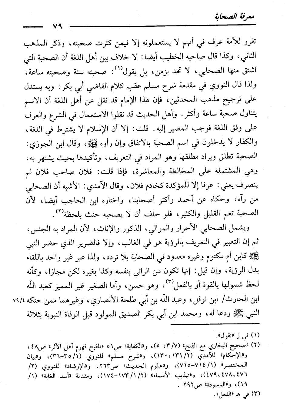 وَكَذَا قَالَ صَاحِبُهُ الْخَطِيبُ أَيْضًا: لَا خِلَافَ بَيْنَ أَهْلِ اللُّغَةِ أَنَّ الصُّحْبَةَ الَّتِي اشْتُقَّ مِنْهَا الصَّحَابِيُّ لَا تُحَدُّ بِزَمَنٍ، بَلْ يَقُولُ: صَحِبْتُهُ سَنَةً، وَصَحِبْتُهُ سَاعَةً. وَلِذَا قَالَ النَّوَوِيُّ فِي مُقَدِّمَةِ (شَرْحِ مُسْلِمٍ) عَقِبَ كَلَامِ الْقَاضِي أَبِي بَكْرٍ: وَبِهِ يُسْتَدَلُّ عَلَى تَرْجِيحِ مَذْهَبِ الْمُحَدِّثِينَ ; فَإِنَّ هَذَا الْإِمَامَ قَدْ نَقَلَ عَنْ أَهْلِ اللُّغَةِ أَنَّ الِاسْمَ يَتَنَاوَلُ صُحْبَةَ سَاعَةٍ أَوْ أَكْثَرَ، وَأَهْلُ الْحَدِيثِ قَدْ نَقَلُوا الِاسْتِعْمَالَ فِي الشَّرْعِ وَالْعُرْفِ عَلَى وَفْقِ اللُّغَةِ، فَوَجَبَ الْمَصِيرُ إِلَيْهِ. قُلْتُ: إِلَّا أَنَّ الْإِسْلَامَ لَا يُشْتَرَطُ فِي اللُّغَةِ، وَالْكُفَّارُ لَا يَدْخُلُونَ فِي اسْمِ الصُّحْبَةِ بِالِاتِّفَاقِ، وَإِنْ رَأَوْهُ - صَلَّى اللَّهُ عَلَيْهِ وَسَلَّمَ -. وَقَالَ ابْنُ الْجَوْزِيِّ: الصُّحْبَةُ تُطْلَقُ وَيُرَادُ مُطْلَقُهَا، وَهُوَ الْمُرَادُ فِي التَّعْرِيفِ، وَتَأْكِيدُهَا بِحَيْثُ يَشْتَهِرُ بِهِ، وَهِيَ الْمُشْتَمِلَةُ عَلَى الْمُخَالَطَةِ وَالْمُعَاشَرَةِ، فَإِذَا قُلْتَ: فُلَانٌ صَاحِبُ فُلَانٍ، لَمْ يَنْصَرِفْ - يَعْنِي: عُرْفًا - إِلَّا لِلْمُؤَكَّدَةِ ; كَخَادِمِ فُلَانٍ. وَقَالَ الْآمِدِيُّ: الْأَشْبَهُ أَنَّ الصَّحَابِيَّ مَنْ رَآهُ. وَحَكَاهُ عَنْ أَحْمَدَ وَأَكْثَرِ أَصْحَابِنَا. وَاخْتَارَهُ ابْنُ الْحَاجِبِ أَيْضًا ; لِأَنَّ الصُّحْبَةَ تَعُمُّ الْقَلِيلَ وَالْكَثِيرَ، فَلَوْ حَلَفَ أَنْ لَا يَصْحَبَهُ حَنِثَ بِلَحْظَةٍ.