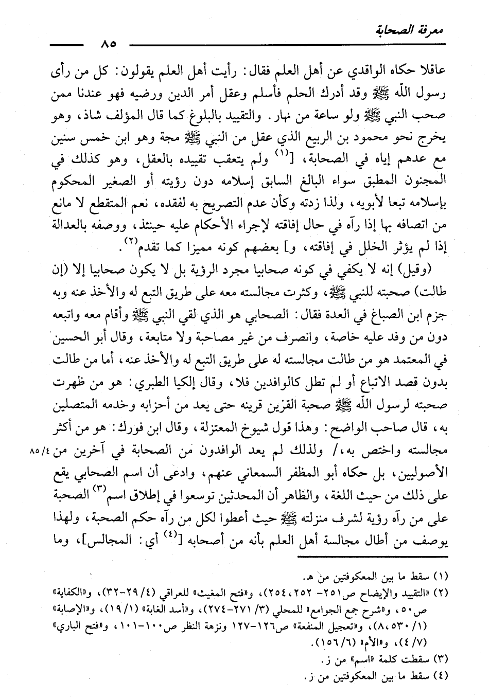 عَاقِلًا، حَكَاهُ الْوَاقِدِيُّ عَنْ أَهْلِ الْعِلْمِ فَقَالَ: رَأَيْتُ أَهْلَ الْعِلْمِ يَقُولُونَ: كُلُّ مَنْ رَأَى رَسُولَ اللَّهِ - صَلَّى اللَّهُ عَلَيْهِ وَسَلَّمَ - وَقَدْ أَدْرَكَ الْحُلُمَ فَأَسْلَمَ وَعَقَلَ أَمْرَ الدِّينِ وَرَضِيَهُ فَهُوَ عِنْدَنَا مِمَّنْ صَحِبَ النَّبِيَّ - صَلَّى اللَّهُ عَلَيْهِ وَسَلَّمَ - وَلَوْ سَاعَةً مِنْ نَهَارٍ.