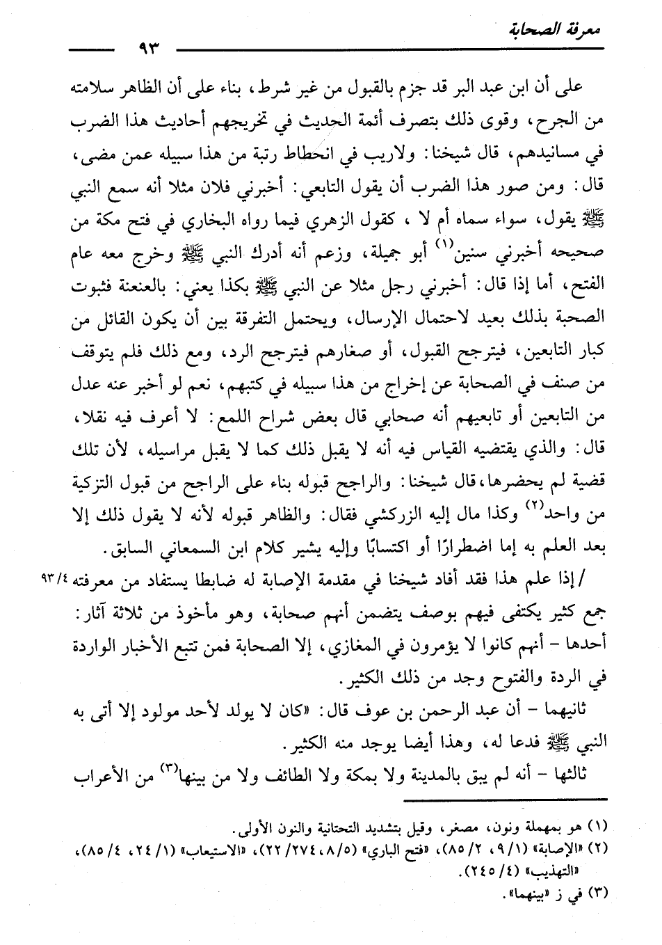 عَلَى أَنَّ ابْنَ عَبْدِ الْبَرِّ قَدْ جَزَمَ بِالْقَبُولِ مِنْ غَيْرِ شَرْطٍ، بِنَاءً عَلَى أَنَّ الظَّاهِرَ سَلَامَتُهُ مِنَ الْجَرْحِ. وَقَوِيَ ذَلِكَ بِتَصَرُّفِ أَئِمَّةِ الْحَدِيثِ فِي تَخْرِيجِهِمْ أَحَادِيثَ هَذَا الضَّرْبِ فِي مَسَانِيدِهِمْ. قَالَ شَيْخُنَا: وَلَا رَيْبَ فِي انْحِطَاطِ رُتْبَةِ مَنْ هَذَا سَبِيلُهُ عَمَّنْ مَضَى. قَالَ: وَمِنْ صُوَرِ هَذَا الضَّرْبِ أَنْ يَقُولَ التَّابِعِيُّ: أَخْبَرَنِي فُلَانٌ مَثَلًا أَنَّهُ سَمِعَ النَّبِيَّ - صَلَّى اللَّهُ عَلَيْهِ وَسَلَّمَ - يَقُولُ، سَوَاءٌ سَمَّاهُ أَمْ لَا ; كَقَوْلِ الزُّهْرِيِّ فِيمَا رَوَاهُ الْبُخَارِيُّ فِي فَتْحِ مَكَّةَ مِنْ صَحِيحِهِ: أَخْبَرَنِي سُنَيْنٌ أَبُو جَمِيلَةَ، وَزَعَمَ أَنَّهُ أَدْرَكَ النَّبِيَّ - صَلَّى اللَّهُ عَلَيْهِ وَسَلَّمَ - وَخَرَجَ مَعَهُ عَامَ الْفَتْحِ. أَمَّا إِذَا قَالَ: أَخْبَرَنِي رَجُلٌ مَثَلًا عَنِ النَّبِيِّ - صَلَّى اللَّهُ عَلَيْهِ وَسَلَّمَ - بِكَذَا، يَعْنِي بِالْعَنْعَنَةِ، فَثُبُوتُ الصُّحْبَةِ بِذَلِكَ بَعِيدٌ ; لِاحْتِمَالِ الْإِرْسَالِ. وَيَحْتَمِلُ التَّفْرِقَةَ بَيْنَ أَنْ يَكُونَ الْقَائِلُ مِنْ كِبَارِ التَّابِعِينَ، فَيَتَرَجَّحُ الْقَبُولُ، أَوْ صِغَارِهِمْ فَيَتَرَجَّحُ الرَّدُّ. وَمَعَ ذَلِكَ فَلَمْ يَتَوَقَّفْ مَنْ صَنَّفَ فِي الصَّحَابَةِ عَنْ إِخْرَاجِ مَنْ هَذَا سَبِيلُهُ فِي كُتُبِهِمْ.