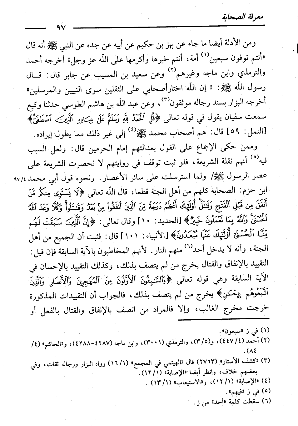 وَنَحْوُهُ قَوْلُ أَبِي مُحَمَّدِ بْنِ حَزْمٍ: الصَّحَابَةُ كُلُّهُمْ مِنْ أَهْلِ الْجَنَّةِ قَطْعًا، قَالَ اللَّهُ تَعَالَى: {لَا يَسْتَوِي مِنْكُمْ مَنْ أَنْفَقَ مِنْ قَبْلِ الْفَتْحِ وَقَاتَلَ أُولَئِكَ أَعْظَمُ دَرَجَةً مِنَ الَّذِينَ أَنْفَقُوا مِنْ بَعْدُ وَقَاتَلُوا وَكُلًّا وَعَدَ اللَّهُ الْحُسْنَى وَاللَّهُ بِمَا تَعْمَلُونَ خَبِيرٌ} [الْحَدِيدِ: 10] ، وَقَالَ تَعَالَى: {إِنَّ الَّذِينَ سَبَقَتْ لَهُمْ مِنَّا الْحُسْنَى أُولَئِكَ عَنْهَا مُبْعَدُونَ} [الْأَنْبِيَاءِ: 101] . قَالَ: فَثَبَتَ أَنَّ الْجَمِيعَ مِنْ أَهْلِ الْجَنَّةِ، وَأَنَّهُ لَا يَدْخُلُ أَحَدٌ مِنْهُمُ النَّارَ ; لِأَنَّهُمُ الْمُخَاطَبُونَ بِالْآيَةِ السَّابِقَةِ. فَإِنْ قِيلَ: التَّقْيِيدُ بِالْإِنْفَاقِ وَالْقِتَالِ يُخْرِجُ مَنْ لَمْ يَتَّصِفْ بِذَلِكَ، وَكَذَلِكَ التَّقْيِيدُ بِالْإِحْسَانِ فِي الْآيَةِ السَّابِقَةِ، وَهِيَ قَوْلُهُ تَعَالَى: {وَالسَّابِقُونَ الْأَوَّلُونَ مِنَ الْمُهَاجِرِينَ وَالْأَنْصَارِ وَالَّذِينَ اتَّبَعُوهُمْ بِإِحْسَانٍ} [التوبة: 100] ، يُخْرِجُ مَنْ لَمْ يَتَّصِفْ بِذَلِكَ. فَالْجَوَابُ أَنَّ التَّقْيِيدَاتِ الْمَذْكُورَةَ خَرَجَتْ مَخْرَجَ الْغَالِبِ، وَإِلَّا فَالْمُرَادُ: مَنِ اتَّصَفَ بِالْإِنْفَاقِ وَالْقِتَالِ بِالْفِعْلِ أَوْ