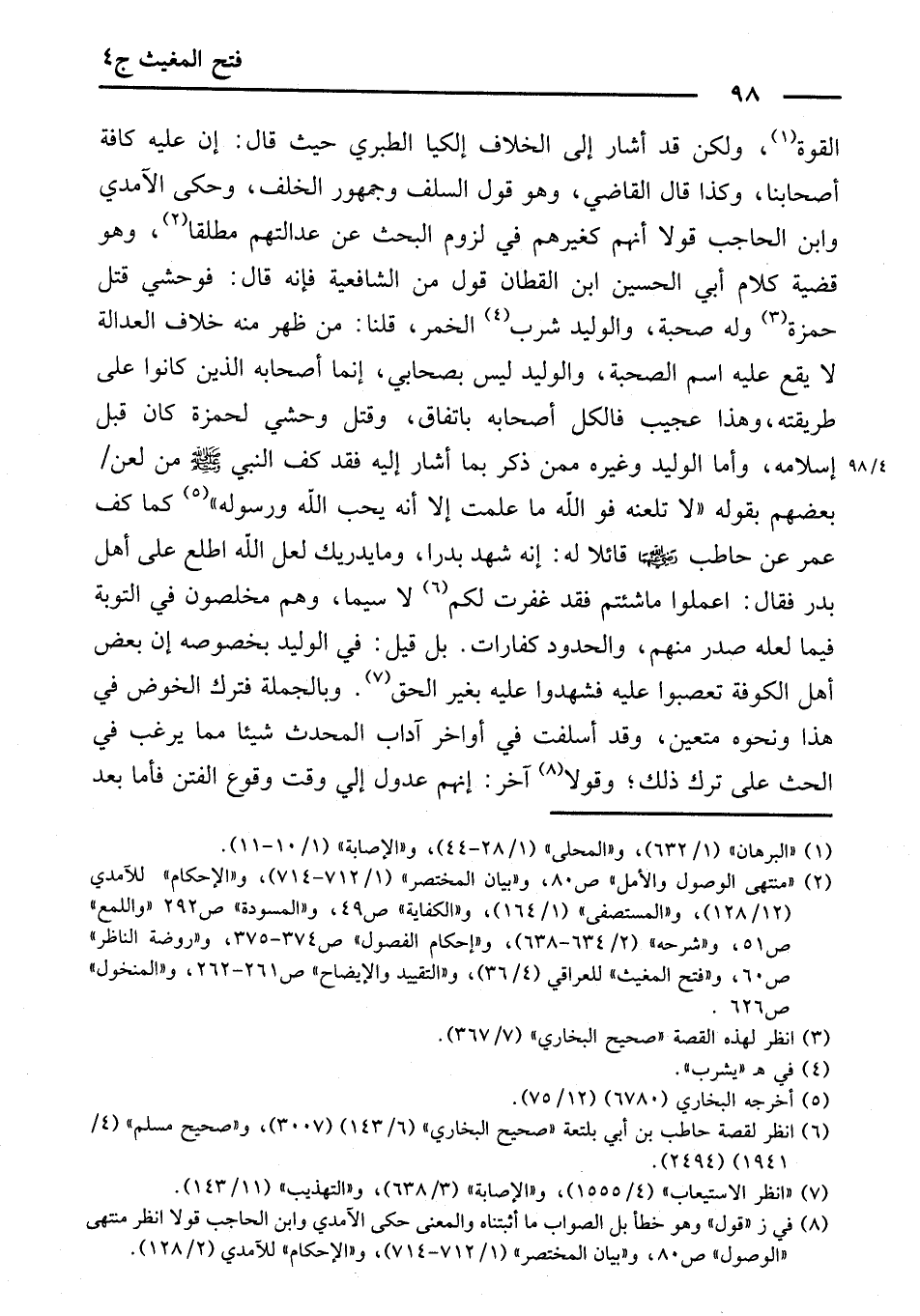 الْقُوَّةِ. وَلَكِنْ قَدْ أَشَارَ إِلَى الْخِلَافِ الْكِيَا الطَّبَرِيُّ حَيْثُ قَالَ: إِنَّ عَلَيْهِ كَافَّةَ أَصْحَابِنَا. وَكَذَا قَالَ الْقَاضِي: هُوَ قَوْلُ السَّلَفِ وَجُمْهُورِ الْخَلَفِ. وَحَكَى الْآمِدِيُّ وَابْنُ الْحَاجِبِ قَوْلًا أَنَّهُمْ كَغَيْرِهِمْ فِي لُزُومِ الْبَحْثِ عَنْ عَدَالَتِهِمْ مُطْلَقًا، وَهُوَ قَضِيَّةُ كَلَامِ أَبِي الْحُسَيْنِ بْنِ الْقَطَّانِ، قَوْلٌ مِنَ الشَّافِعِيَّةِ ; فَإِنَّهُ قَالَ: فَوَحْشِيٌّ قَتَلَ حَمْزَةَ وَلَهُ صُحْبَةٌ، وَالْوَلِيدُ شَرِبَ الْخَمْرَ. قُلْنَا: مَنْ ظَهَرَ مِنْهُ خِلَافُ الْعَدَالَةِ لَا يَقَعُ عَلَيْهِ اسْمُ الصُّحْبَةِ، وَالْوَلِيدُ لَيْسَ بِصَحَابِيٍّ، إِنَّمَا أَصْحَابُهُ الَّذِينَ كَانُوا عَلَى طَرِيقَتِهِ. وَهَذَا عَجِيبٌ، فَالْكُلُّ أَصْحَابُهُ بِاتِّفَاقٍ، وَقَتْلُ وَحْشِيٍّ لِحَمْزَةٍ كَانَ قَبْلَ إِسْلَامِهِ، وَأَمَّا الْوَلِيدُ وَغَيْرُهُ مِمَّنْ ذُكِرَ بِمَا أَشَارَ إِلَيْهِ فَقَدْ كَفَّ النَّبِيُّ - صَلَّى اللَّهُ عَلَيْهِ وَسَلَّمَ - مِنْ لَعْنِ بَعْضِهِمْ بِقَوْلِهِ: ( «لَا تَلْعَنْهُ ; فَوَاللَّهِ مَا عَلِمْتُ إِلَّا أَنَّهُ يُحِبُّ اللَّهَ وَرَسُولَهُ» ) . كَمَا كَفَّ عُمَرَ عَنْ حَاطِبٍ رَضِيَ اللَّهُ عَنْهُمَا قَائِلًا لَهُ: ( «إِنَّهُ شَهِدَ بَدْرًا، وَمَا يُدْرِيكَ لَعَلَّ اللَّهَ اطَّلَعَ عَلَى أَهْلِ بَدْرٍ فَقَالَ: اعْمَلُوا مَا شِئْتُمْ ; فَقَدْ غَفَرْتُ لَكُمْ» ) . لَا سِيَّمَا وَهُمْ مُخْلِصُونَ فِي التَّوْبَةِ فِيمَا لَعَلَّهُ صَدَرَ مِنْهُمْ، وَالْحُدُودُ كَفَّارَاتٌ. بَلْ قِيلَ فِي الْوَلِيدِ بِخُصُوصِهِ: إِنَّ بَعْضَ أَهْلِ الْكُوفَةِ تَعَصَّبُوا عَلَيْهِ فَشَهِدُوا عَلَيْهِ بِغَيْرِ الْحَقِّ.