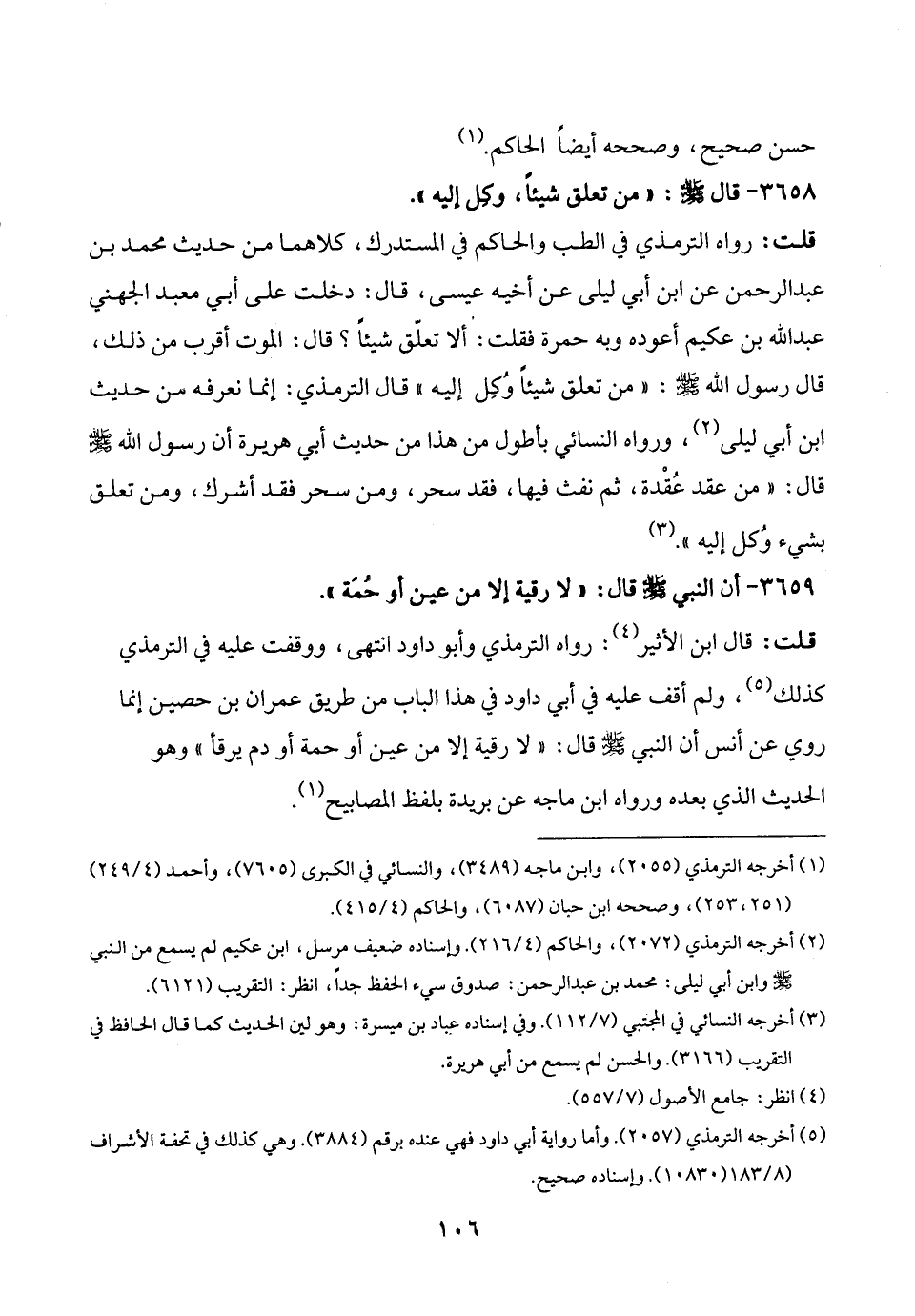 قلت: رواه الترمذي في الطب والحاكم في المستدرك، كلاهما من حديث محمَّد بن عبد الرحمن عن ابن أبي ليلى عن أخيه عيسى، قال: دخلت على أبي معبد الجهني عبد الله بن عكيم أعوده وبه حمرة فقلت: ألا تعلّق شيئًا؟ قال: الموت أقرب من ذلك، قال رسول الله -صلى الله عليه وسلم -: "من تعلق شيئًا وُكل إليه" قال الترمذي: إنما نعرفه من حديث ابن أبي ليلى (¬2)، ورواه النسائي بأطول من هذا من حديث أبي هريرة أن رسول الله - صلى الله عليه وسلم - قال: "من عقد عُقْدة، ثم نفث فيها، فقد سحر، ومن سحر فقد أشرك، ومن تعلق بشيء وُكل إليه". (¬3)