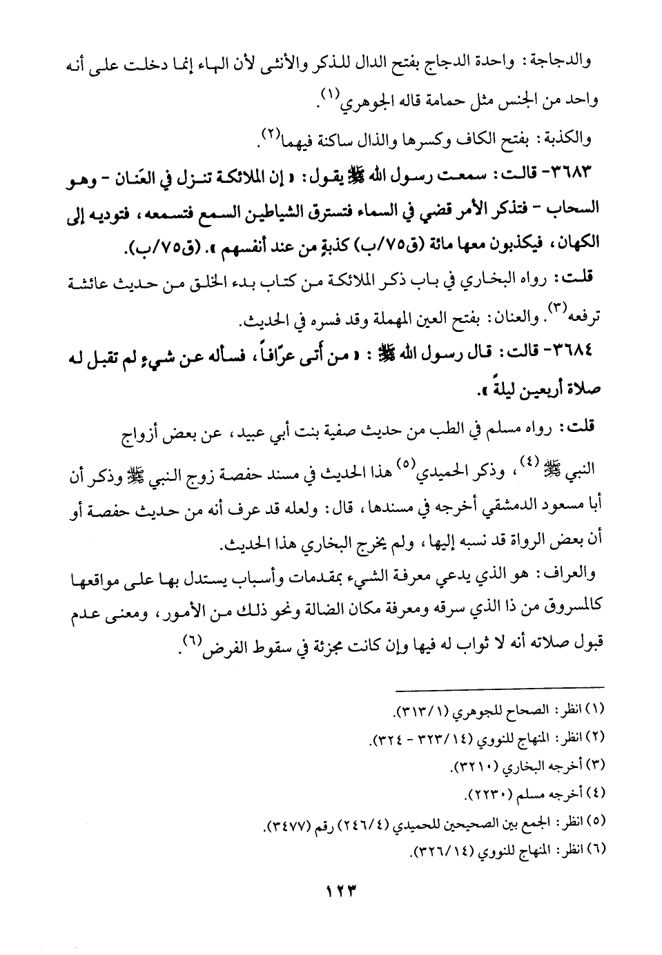 والعراف: هو الذي يدعي معرفة الشيء بمقدمات وأسباب يستدل بها على مواقعها كالمسروق من ذا الذي سرقه ومعرفة مكان الضالة ونحو ذلك من الأمور، ومعنى عدم قبول صلاته أنَّه لا ثواب له فيها وإن كانت مجزئة في سقوط الفرض (¬6).