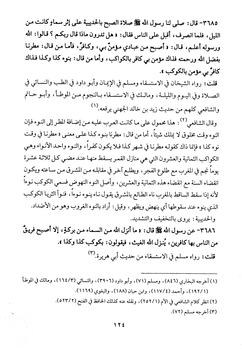 3685 - قال: صلى لنا رسول الله -صلى الله عليه وسلم- صلاة الصبح بالحديبية على إثر سماءٍ كانت من الليل، فلما انصرف، أقبل على الناس فقال: "هل تدرون ماذا قال ربكم؟ قالوا: الله ورسوله أعلم، قال: "أصبح من عبادي مؤمنٌ بي، وكافرٌ، فأما من قال: مطرنا بفضل الله ورحمته فذاك مؤمن بي كافر بالكواكب، وأما من قال: بنوء كذا وكذا فذاك كافرٌ بي مؤمن بالكوكب".