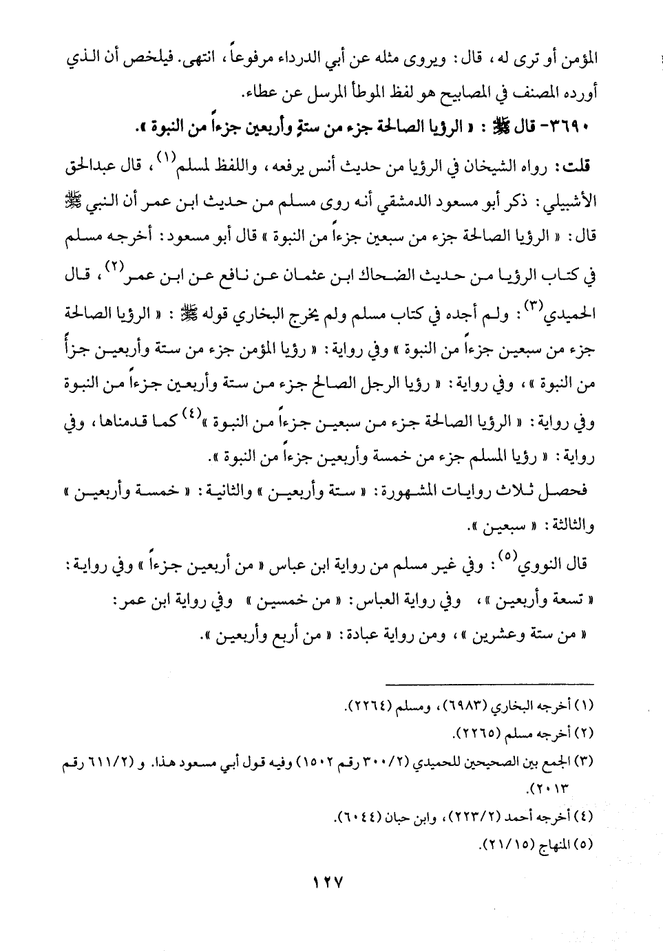 3690 - قال - صلى الله عليه وسلم -: "الرؤيا الصالحة جزء من ستةٍ وأربعين جزءًا من النبوة".