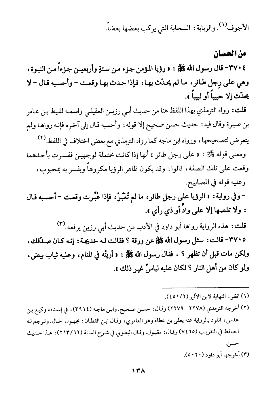 3704 - قال رسول الله -صلى الله عليه وسلم-: "رؤيا المؤمن جزء من ستةٍ وأربعين جزءًا من النبوة، وهي على رِجل طائر، ما لم يحدّث بها، فإذا حدث بها وقعت -وأحسبه قال- لا يحدّث إلا حبيبًا أو لبيبًا".