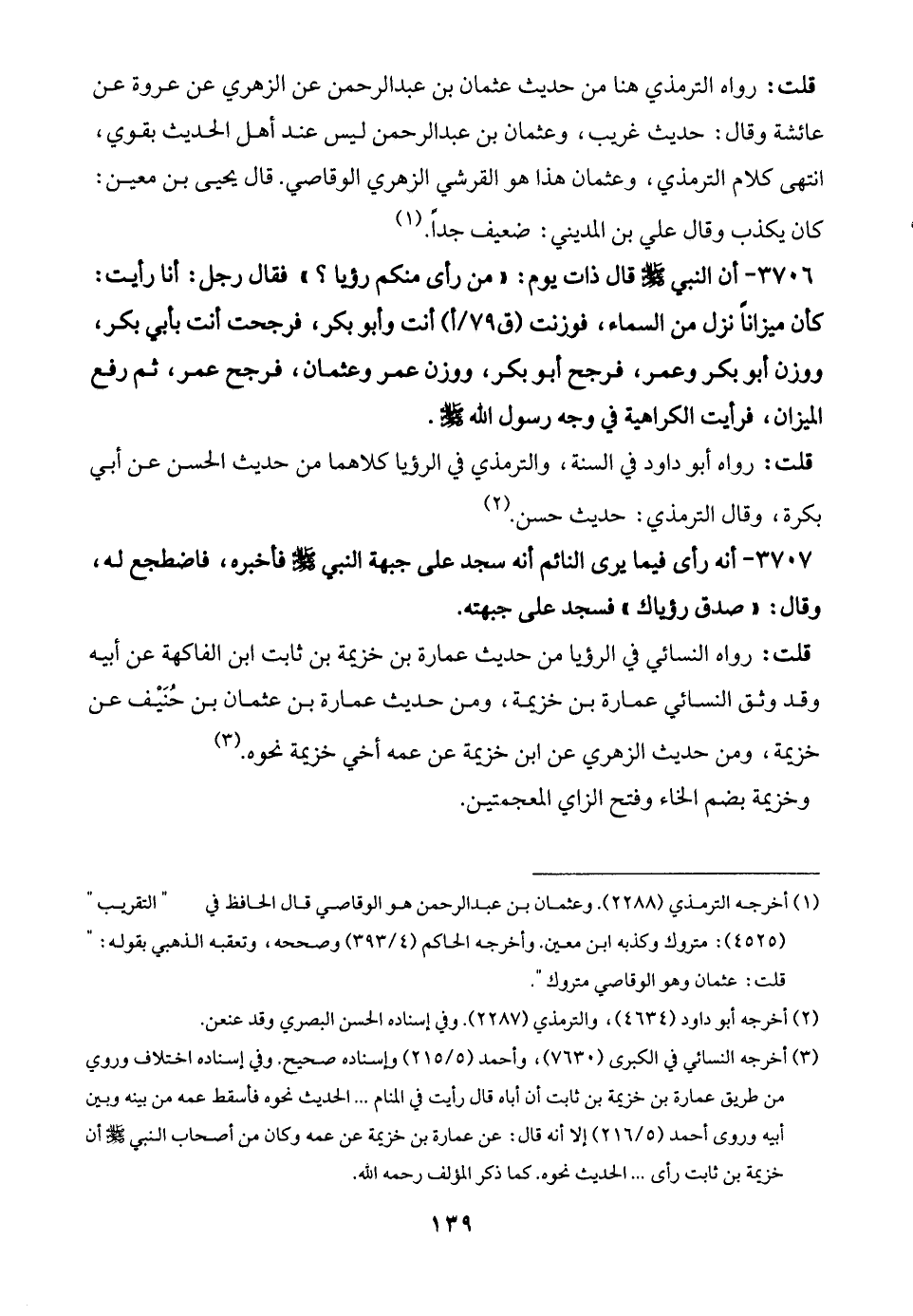 قلت: رواه النسائيُّ في الرؤيا من حديث عمارة بن خزيمة بن ثابت ابن الفاكهة عن أبيه وقد وثق النسائيُّ عمارة بن خزيمة، ومن حديث عمارة بن عثمان بن حُنَيْف عن خزيمة، ومن حديث الزهري عن ابن خزيمة عن عمه أخي خزيمة نحوه. (¬3)