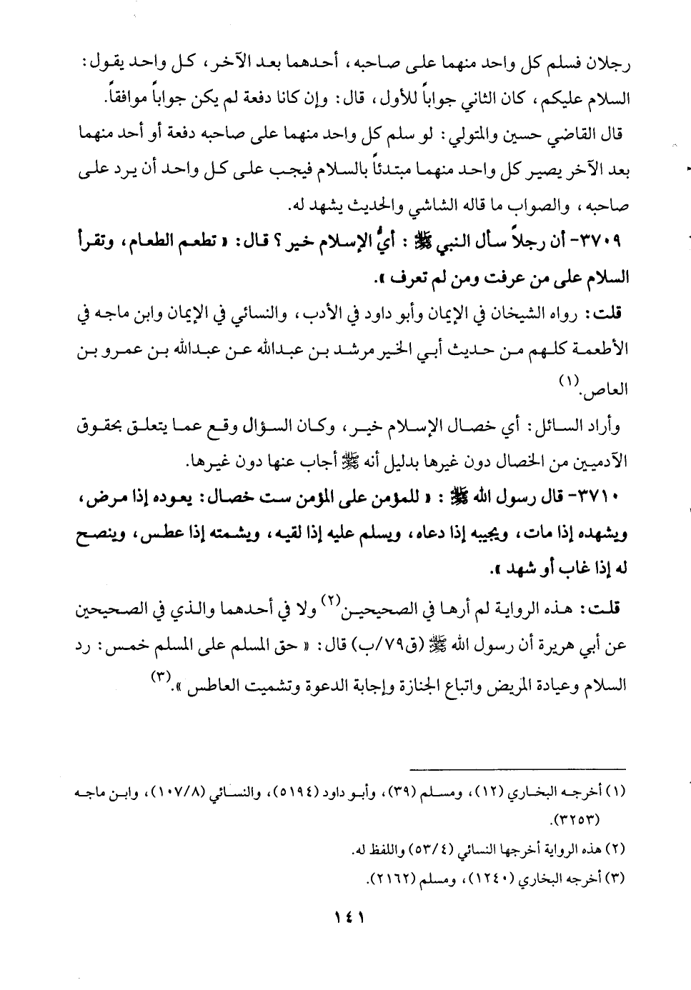 قلت: هذه الرواية لم أرها في الصحيحين (¬2) ولا في أحدهما والذي في الصحيحين عن أبي هريرة أن رسول الله - صلى الله عليه وسلم - قال: "حق المسلم على المسلم خمس: رد السلام وعيادة المريض واتباع الجنازة وإجابة الدعوة وتشميت العاطس". (¬3)