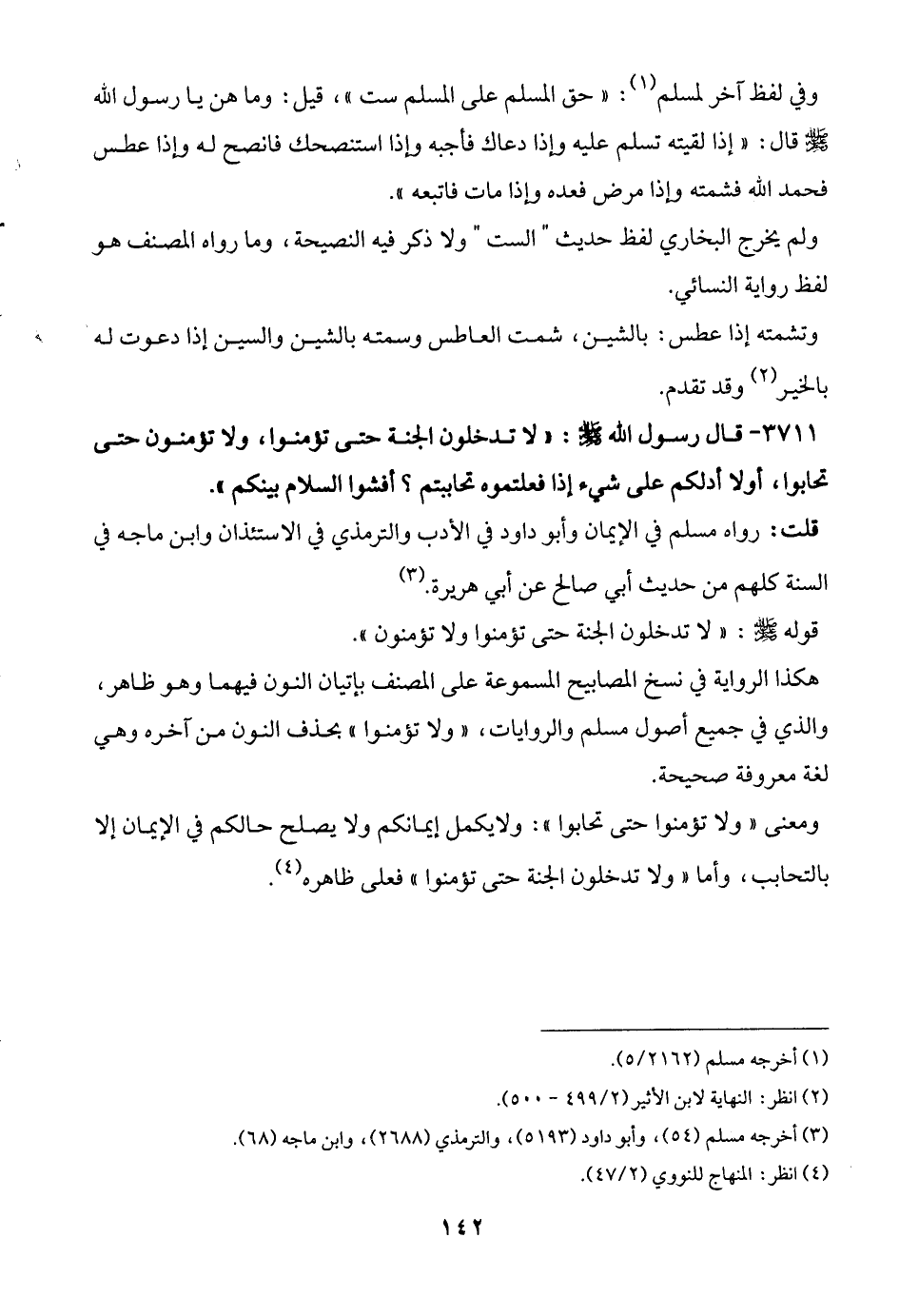 قلت: رواه مسلم في الإيمان وأبو داود في الأدب والترمذي في الاستئذان وابن ماجه في السنة كلهم من حديث أبي صالح عن أبي هريرة. (¬3)