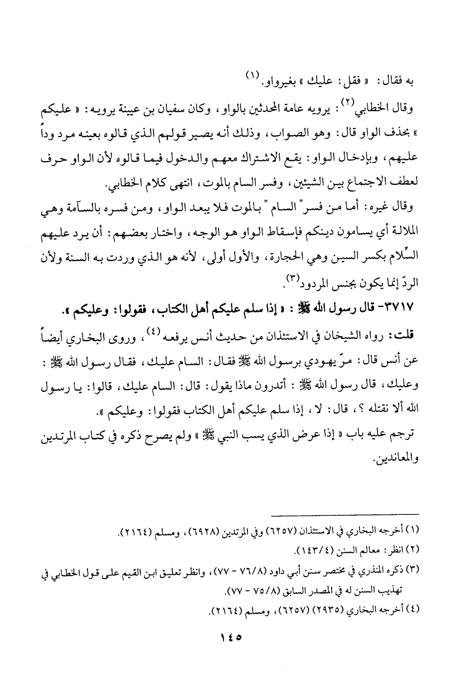 وقال غيره: أما من فسر "السام" بالموت فلا يبعد الواو، ومن فسره بالسآمة وهي الملالة أي يسامون دينكم فإسقاط الواو هو الوجه، واختار بعضهم: أن يرد عليهم السِّلام بكسر السين وهي الحجارة، والأول أولى، لأنه هو الذي وردت به السنة ولأن الردّ إنما يكون بجنس المردود (¬3).